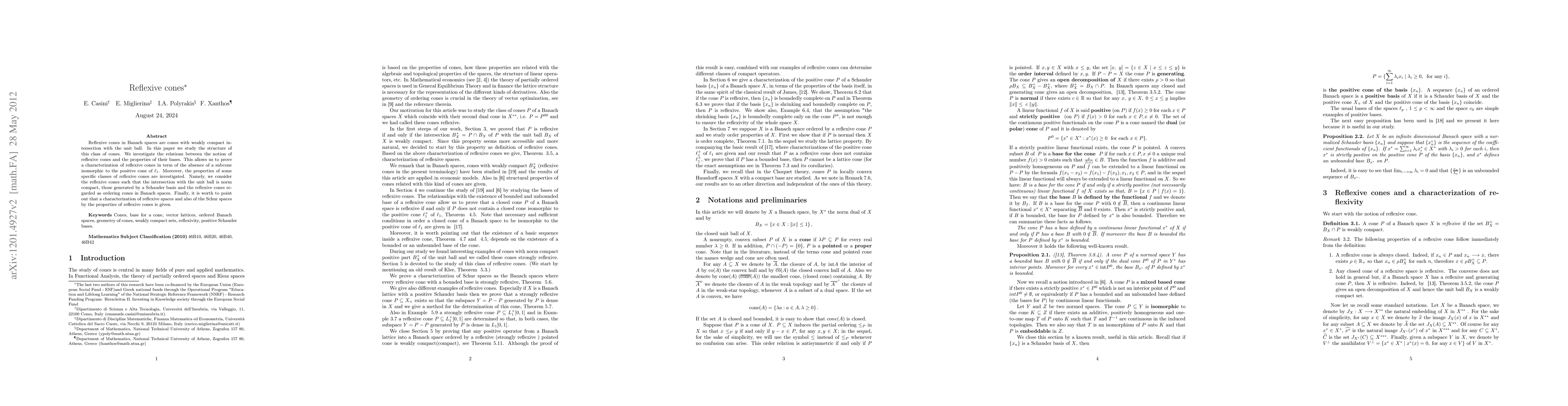 This paper explores the structure and properties of reflexive cones in Banach spaces, focusing on their weakly compact intersections with the unit ball. It characterizes reflexive cones by the absence of a subcone isomorphic to the positive cone of \(\ell_{1}\) and investigates specific classes of reflexive cones, including norm compact intersections, those generated by a Schauder basis, and reflexive cones as ordering cones.