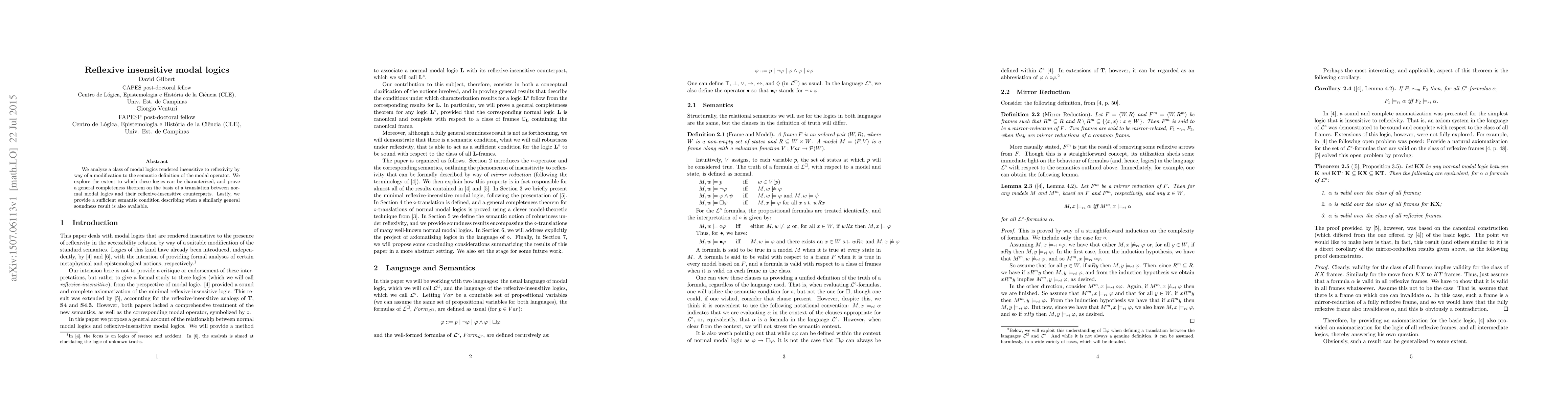 This paper investigates modal logics that are made insensitive to reflexivity through a modified semantic definition of the modal operator. It establishes a completeness theorem via a translation between normal modal logics and their reflexive-insensitive versions, and provides a sufficient condition for soundness.