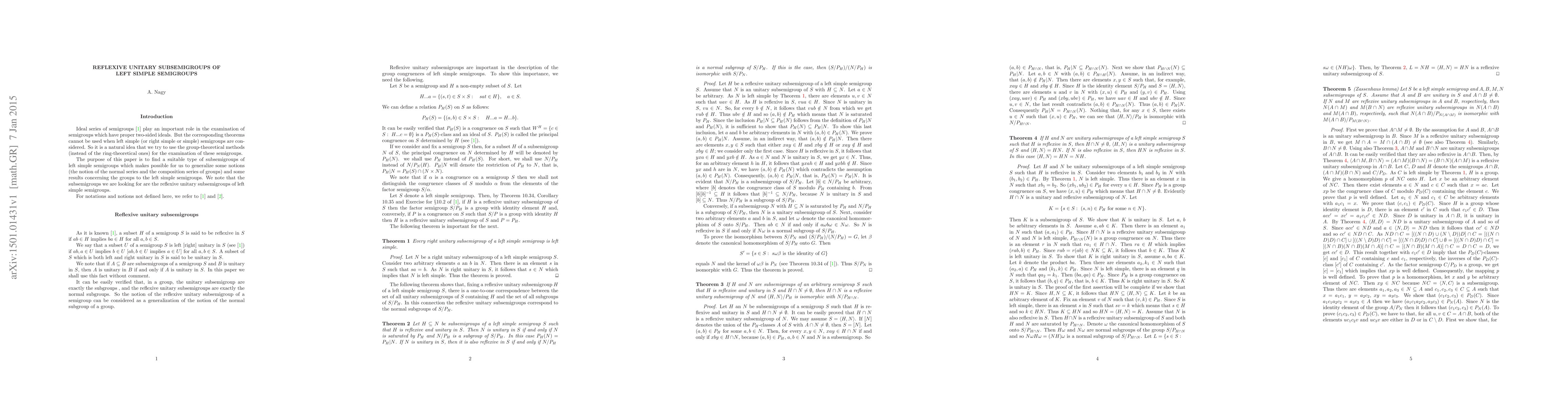 Ideal series of semigroups play an important role in the examination of semigroups which have proper two-sided ideals. But the corresponding theorems cannot be used when left simple (or right simple or simple) semigroups are considered. So it is a natural idea that we try to use the group theoretical methods (instead of the ring theoretical ones) for the examination of these semigroups. The purpose of this paper is to find a suitable type of subsemigroups of left simple semigroups which makes possible for us to generalize some notions (the notion of the normal series and the composition series of groups) and some results concerning the groups to the left simple semigroups. We note that the subsemigroups we are looking for are the reflexive unitary subsemigroups of left simple semigroups.