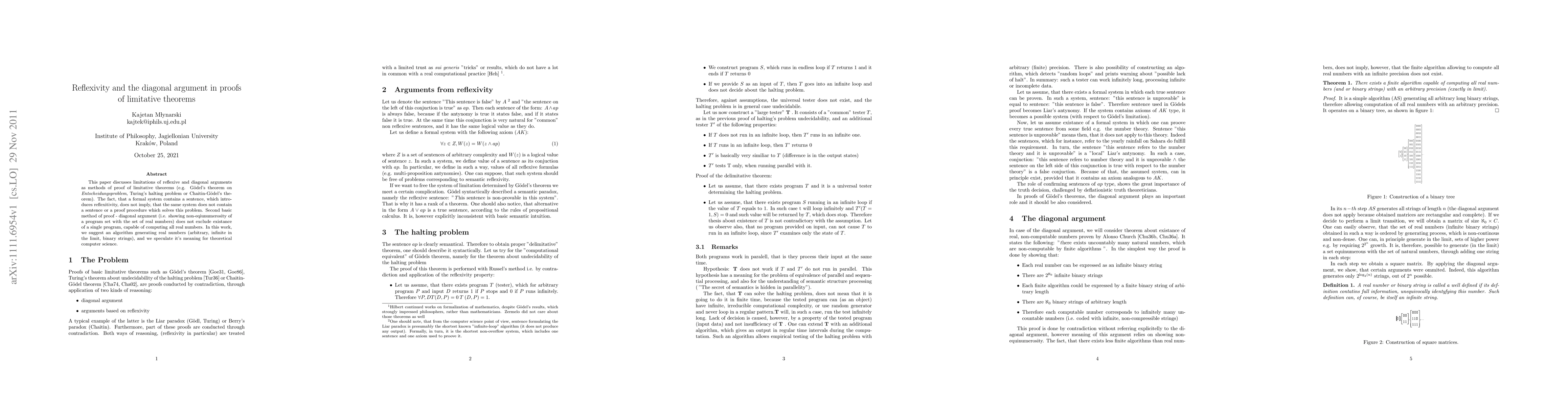 This paper critiques reflexive and diagonal arguments as proof methods for limitative theorems, arguing that reflexivity does not preclude solutions within a formal system, and the diagonal argument does not exclude the existence of a single program computing all real numbers. The authors propose an algorithm for generating real numbers and discuss its implications for theoretical computer science.