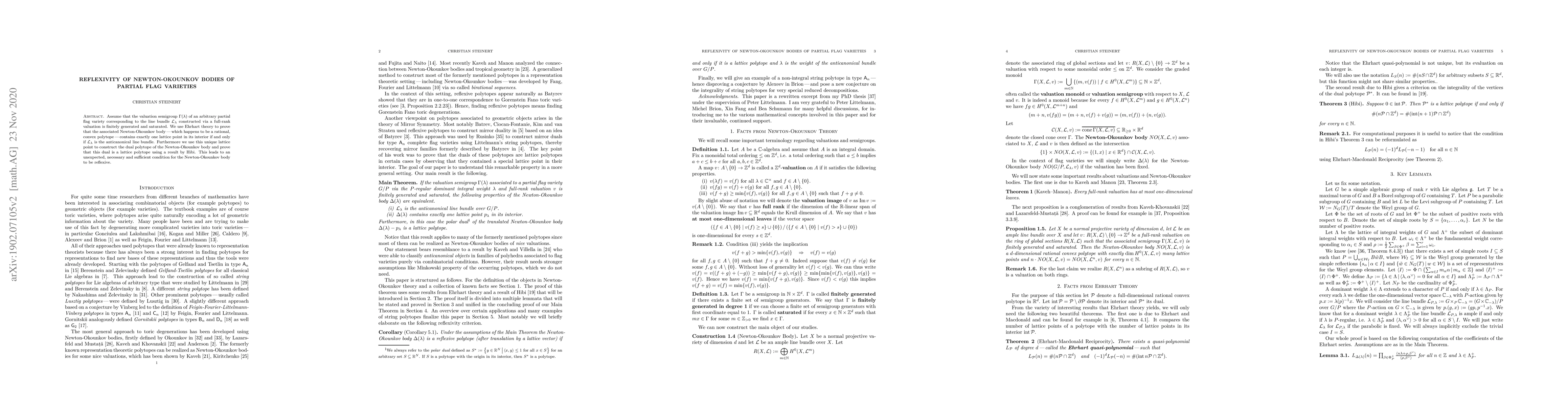 Assume that the valuation semigroup $\Gamma(\lambda)$ of an arbitrary partial flag variety corresponding to the line bundle $\mathcal L_\lambda$ constructed via a full-rank valuation is finitely generated and saturated. We use Ehrhart theory to prove that the associated Newton-Okounkov body, which happens to be a rational, convex polytope, contains exactly one lattice point in its interior if and only if $\mathcal L_\lambda$ is the anticanonical line bundle. Furthermore we use this unique lattice point to construct the dual polytope of the Newton-Okounkov body and prove that this dual is a lattice polytope using a result by Hibi. This leads to an unexpected, necessary and sufficient condition for the Newton-Okounkov body to be reflexive.