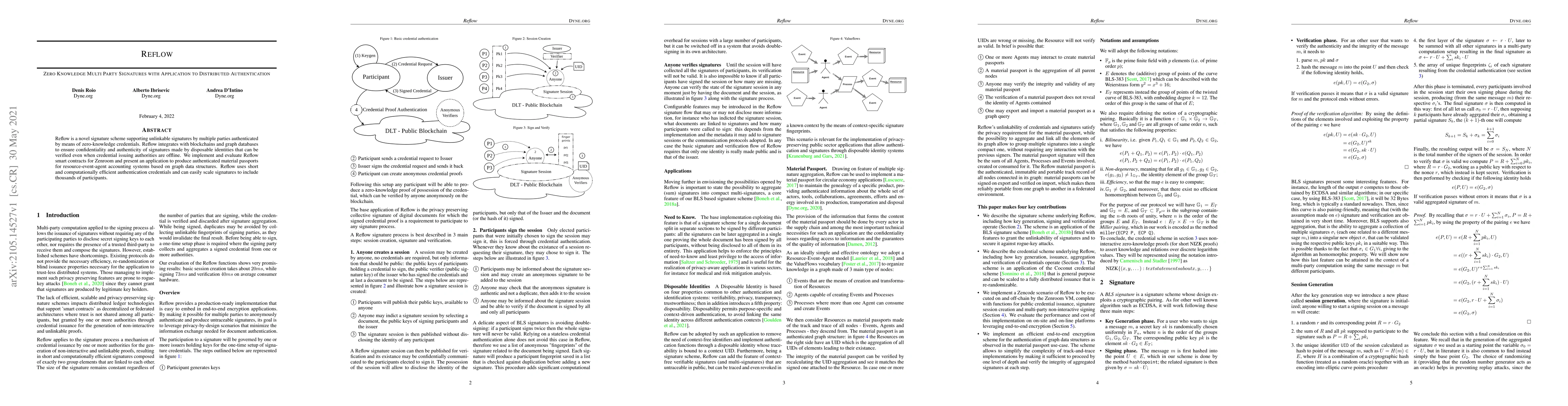Reflow is a zero-knowledge multi-party signature scheme that enables secure authentication using disposable identities with blockchain integration. It supports thousands of participants with short and efficient authentication credentials.