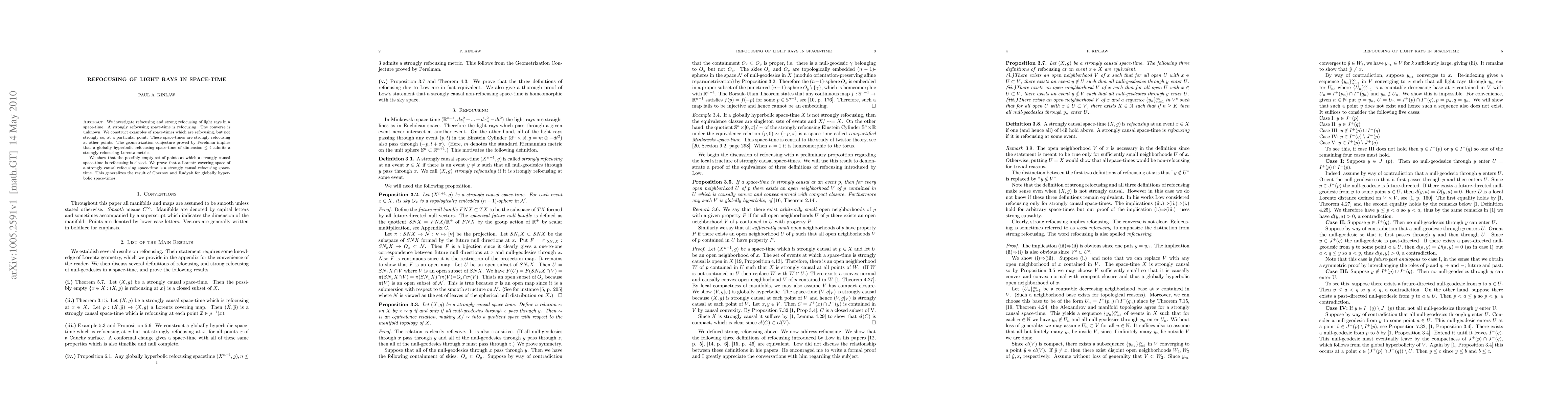 We investigate refocusing and strong refocusing of light rays in a space-time. A strongly refocusing space-time is refocusing. The converse is unknown. We construct examples of space-times which are refocusing, but not strongly so, at a particular point. These space-times are strongly refocusing at other points. The geometrization conjecture proved by Perelman implies that a globally hyperbolic refocusing space-time of dimension $\leq 4$ admits a strongly refocusing Lorentz metric. We show that the possibly empty set of points at which a strongly causal space-time is refocusing is closed. We prove that a Lorentz covering space of a strongly causal refocusing space-time is a strongly causal refocusing space-time. This generalizes the result of Chernov and Rudyak for globally hyperbolic space-times.