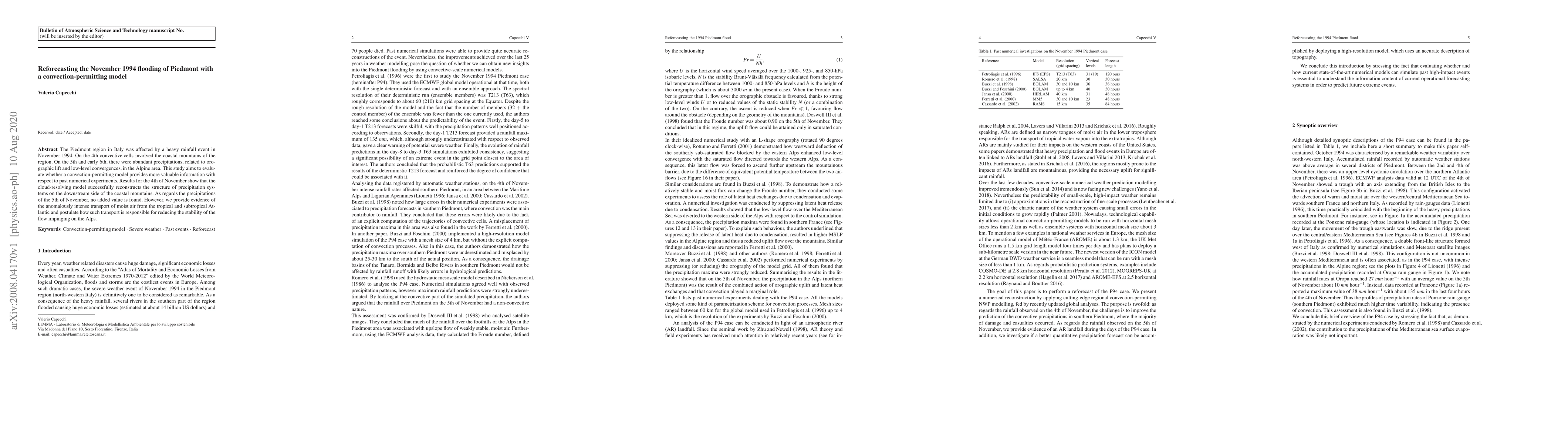 The Piedmont region in Italy was affected by a heavy rainfall event in November 1994. On the 4th convective cells involved the coastal mountains of the region. On the 5th and early 6th, there were abundant precipitations, related to orographic lift and low-level convergences, in the Alpine area. This study aims to evaluate whether a convection-permitting model provides more valuable information with respect to past numerical experiments. Results for the 4th of November show that the cloud-resolving model successfully reconstructs the structure of precipitation systems on the downstream side of the coastal mountains. As regards the precipitations of the 5th of November, no added value is found. However, we provide evidence of the anomalously intense transport of moist air from the tropical and subtropical Atlantic and postulate how such transport is responsible for reducing the stability of the flow impinging on the Alps.