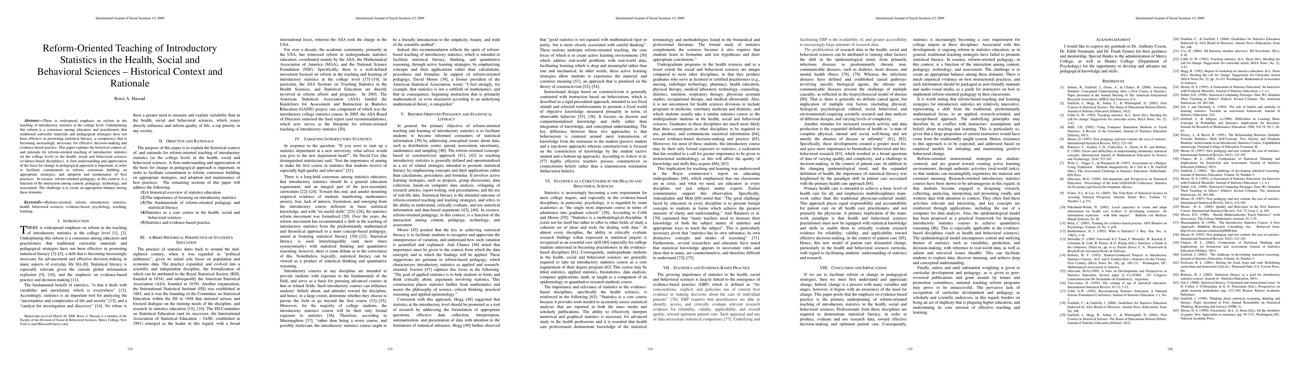 This paper discusses the historical context and rationale for reform-oriented teaching of introductory statistics in health, social, and behavioral sciences, emphasizing the need for improved statistical literacy and the shift from traditional to more effective pedagogical strategies. It highlights the importance of understanding the basis for these changes to foster commitment and consensus on best practices.