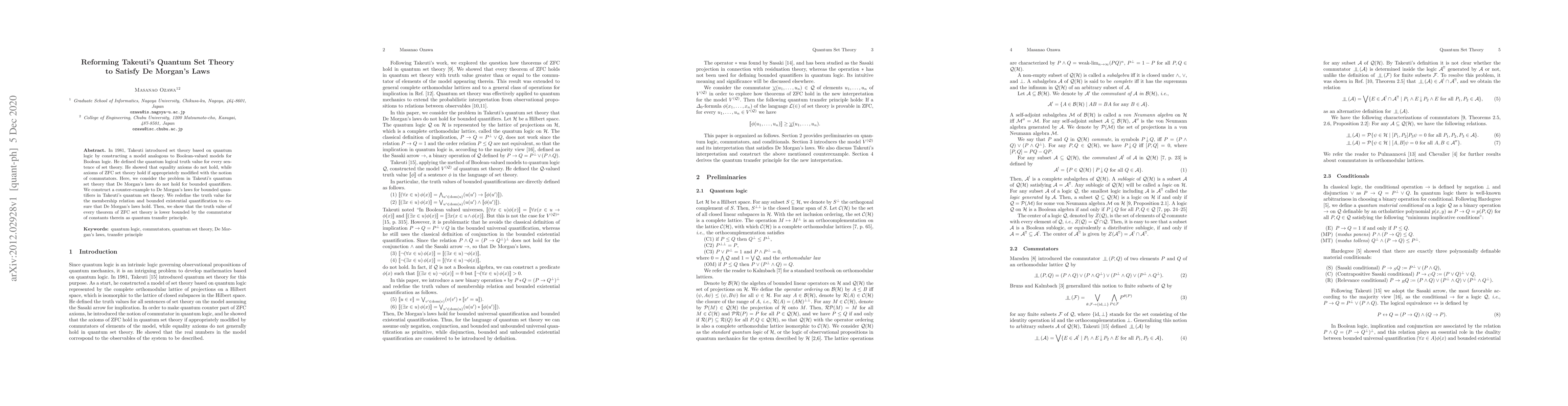 This paper addresses the issue in Takeuti's quantum set theory where De Morgan's laws fail for bounded quantifiers. It proposes a reformulation of the membership relation and bounded existential quantification to satisfy De Morgan's laws, and demonstrates the quantum transfer principle under these modifications.