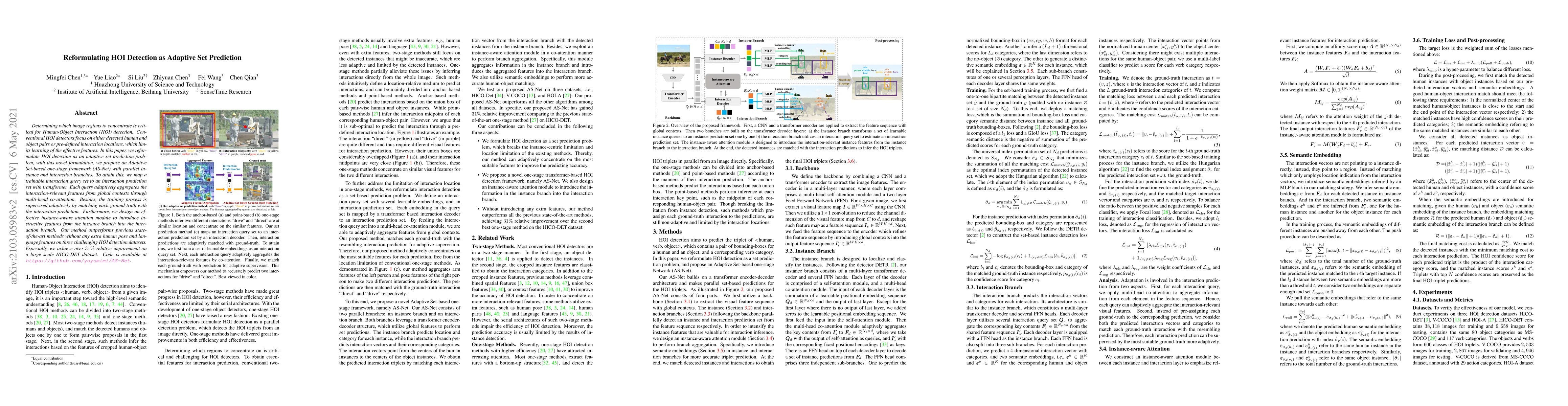 Researchers reformulate Human-Object Interaction (HOI) detection as an adaptive set prediction problem, introducing a new one-stage framework called AS-Net that outperforms state-of-the-art methods on three HOI datasets with over 31% relative improvement.