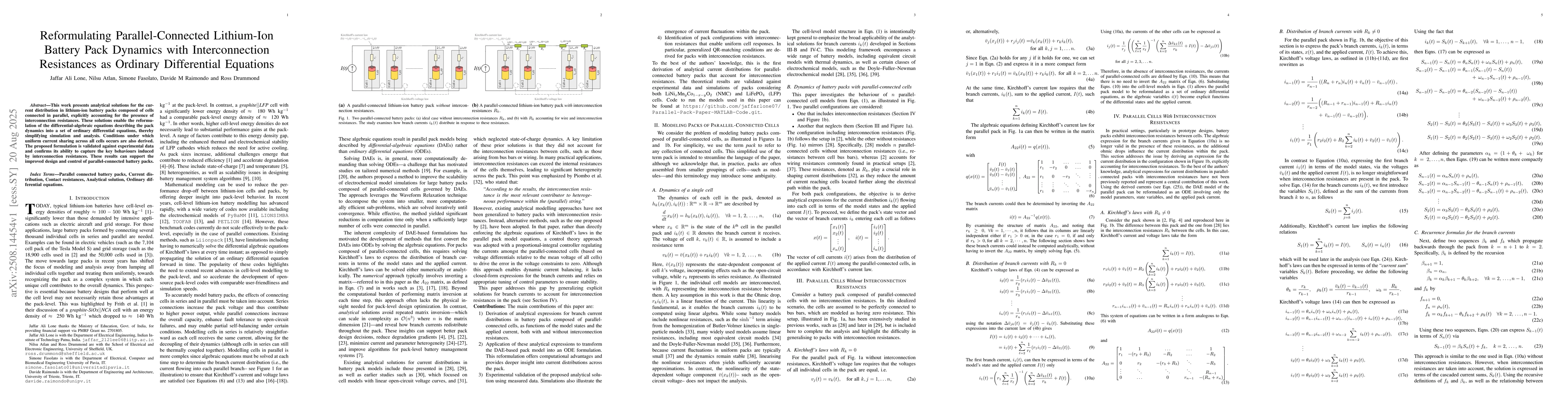 This research provides analytical solutions for current distribution in parallel-connected lithium-ion battery packs, considering interconnection resistances. It transforms complex differential-algebraic equations into simpler ordinary differential equations, validated by experimental data, aiding in the design and control of battery packs.