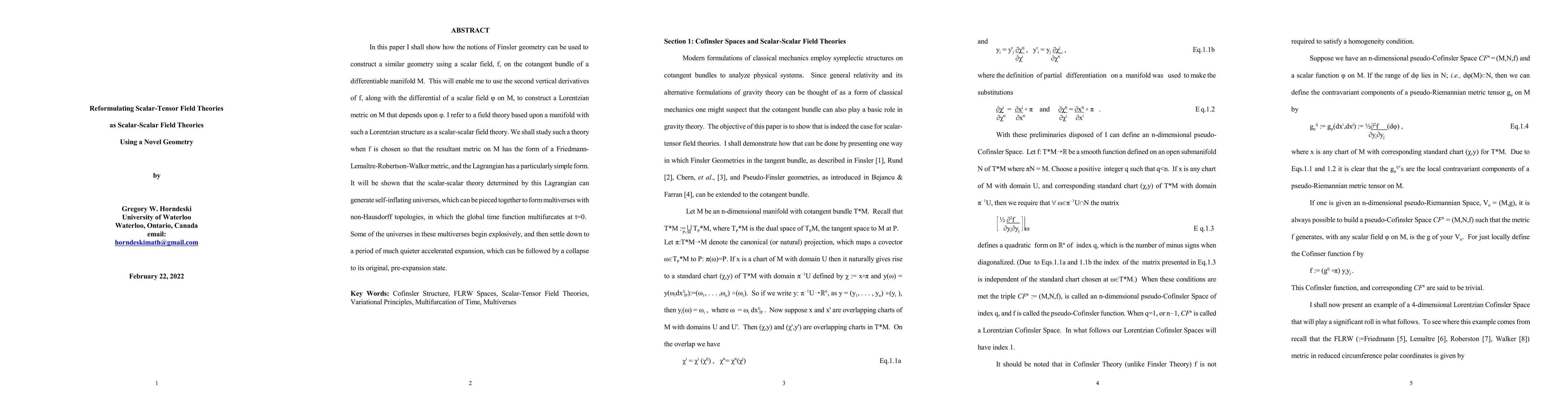 This paper reformulates scalar-tensor field theories using Finsler geometry to construct a scalar-scalar field theory on a differentiable manifold. The theory generates self-inflating universes that can form multiverses with non-Hausdorff topologies, where probabilities for universes are assigned based on their action values.