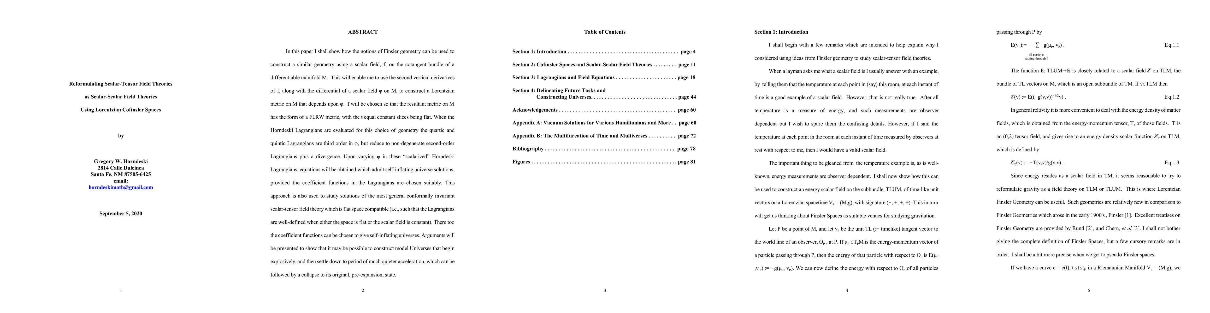 In this paper I shall show how notions of Finsler geometry can be used to construct a new type of geometry using a scalar field, f, on the cotangent bundle of a differentiable manifold, M. This new geometry will be called Lorentzian Cofinsler geometry. This geometry will enable me to use the second vertical derivatives of f, along with the differential of the scalar field, phi on M, to construct a Lorentzian metric tensor on M, that depends upon phi. f will be chosen so that the resultant metric on M has the form of a FLRW metric, with the t equal constant slices being flat. When the Horndeski Lagrangians are evaluated for this choice of geometry the quartic and quintic Lagrangians are of third order, but reduce to non-degenerate second-order Lagrangians plus a divergence. Upon varying phi in these "scalarized" Horndeski Lagrangians, equations will be obtained which admit self-inflating universe solutions, provided that the coefficient functions appearing in the Horndeski Lagrangians are chosen suitably. This approach is also used to study solutions of the most general conformally invariant scalar-tensor field theory which is flat space compatible (i.e., such that the Lagrangians of the field theory are well-defined when either the space is flat or the scalar field is constant). There too the coefficient functions can be chosen to give self-inflating universes. Arguments will be presented to show that it is possible to construct model universes that begin explosively, and then settle down to a period of much quieter acceleration which either continues forever, or stops and collapses to the models original, pre-expansion, state.