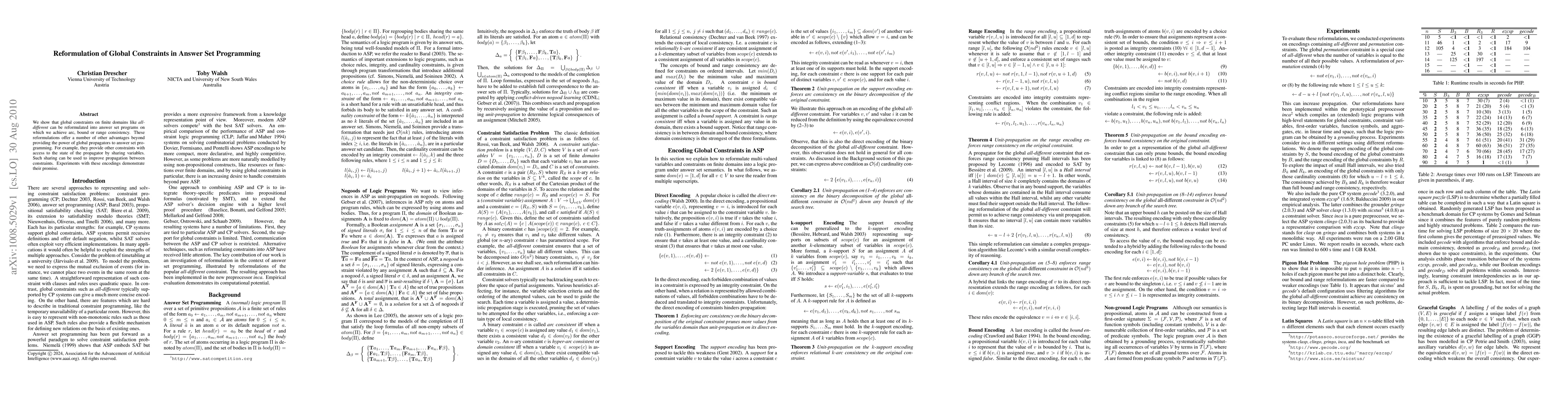 This paper reformulates global constraints like "all-different" into answer set programs, achieving consistency and enhancing propagation between constraints through variable sharing. Experimental results show promising improvements in constraint satisfaction.