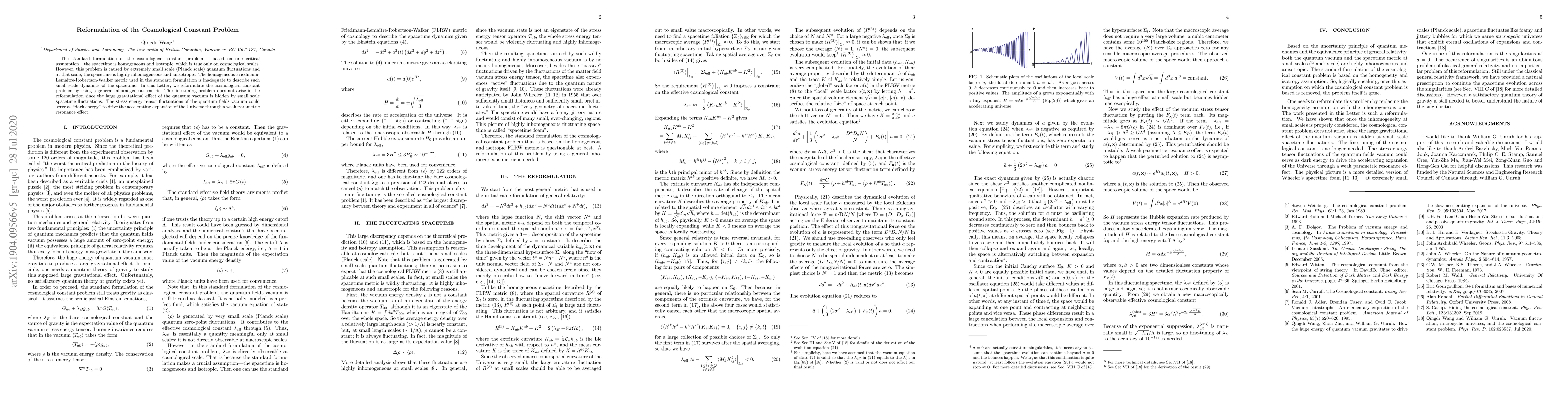 The standard formulation of the cosmological constant problem is based on one critical assumption---the spacetime is homogeneous and isotropic, which is true only on cosmological scales. However, this problem is caused by extremely small scale (Planck scale) quantum fluctuations and at that scale, the spacetime is highly inhomogeneous and anisotropic. The homogeneous Friedmann-Lema\^{i}tre-Robertson-Walker metric used in the standard formulation is inadequate to describe such small scale dynamics of the spacetime. In this Letter, we reformulate the cosmological constant problem by using a general inhomogeneous metric. The fine-tuning problem does not arise in the reformulation since the large gravitational effect of the quantum vacuum is hidden by small scale spacetime fluctuations. The stress energy tensor fluctuations of the quantum fields vacuum could serve as "dark energy" to drive the accelerating expansion of the Universe through a weak parametric resonance effect.
