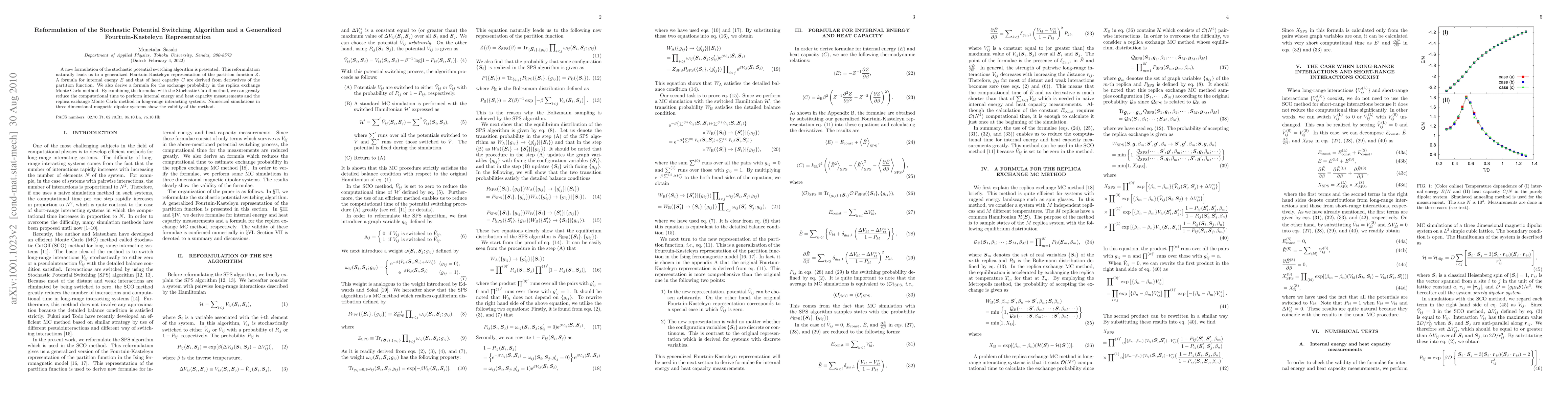 The paper presents a new formulation of the stochastic potential switching algorithm, leading to a generalized Fourtuin-Kasteleyn representation of the partition function Z. It derives formulas for internal energy E and heat capacity C from derivatives of Z, and also for the exchange probability in the replica exchange Monte Carlo method.