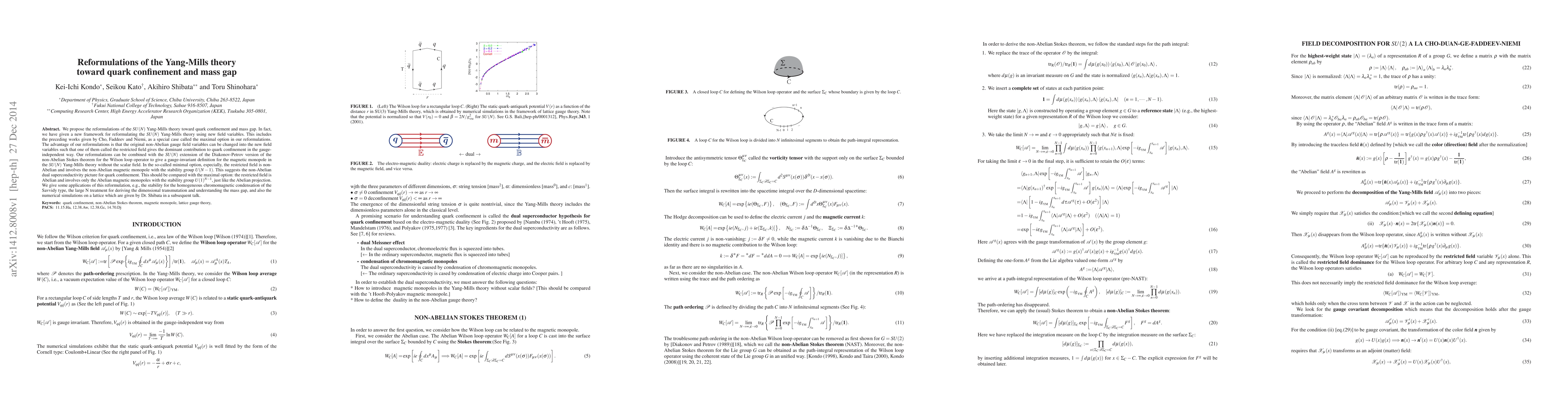 We propose the reformulations of the $SU(N)$ Yang-Mills theory toward quark confinement and mass gap. In fact, we have given a new framework for reformulating the $SU(N)$ Yang-Mills theory using new field variables. This includes the preceding works given by Cho, Faddeev and Niemi, as a special case called the maximal option in our reformulations. The advantage of our reformulations is that the original non-Abelian gauge field variables can be changed into the new field variables such that one of them called the restricted field gives the dominant contribution to quark confinement in the gauge-independent way. Our reformulations can be combined with the $SU(N)$ extension of the Diakonov-Petrov version of the non-Abelian Stokes theorem for the Wilson loop operator to give a gauge-invariant definition for the magnetic monopole in the $SU(N)$ Yang-Mills theory without the scalar field. In the so-called minimal option, especially, the restricted field is non-Abelian and involves the non-Abelian magnetic monopole with the stability group $U(N-1)$. This suggests the non-Abelian dual superconductivity picture for quark confinement. This should be compared with the maximal option: the restricted field is Abelian and involves only the Abelian magnetic monopoles with the stability group $U(1)^{N-1}$, just like the Abelian projection. We give some applications of this reformulation, e.g., the stability for the homogeneous chromomagnetic condensation of the Savvidy type, the large N treatment for deriving the dimensional transmutation and understanding the mass gap, and also the numerical simulations on a lattice which are given by Dr. Shibata in a subsequent talk.