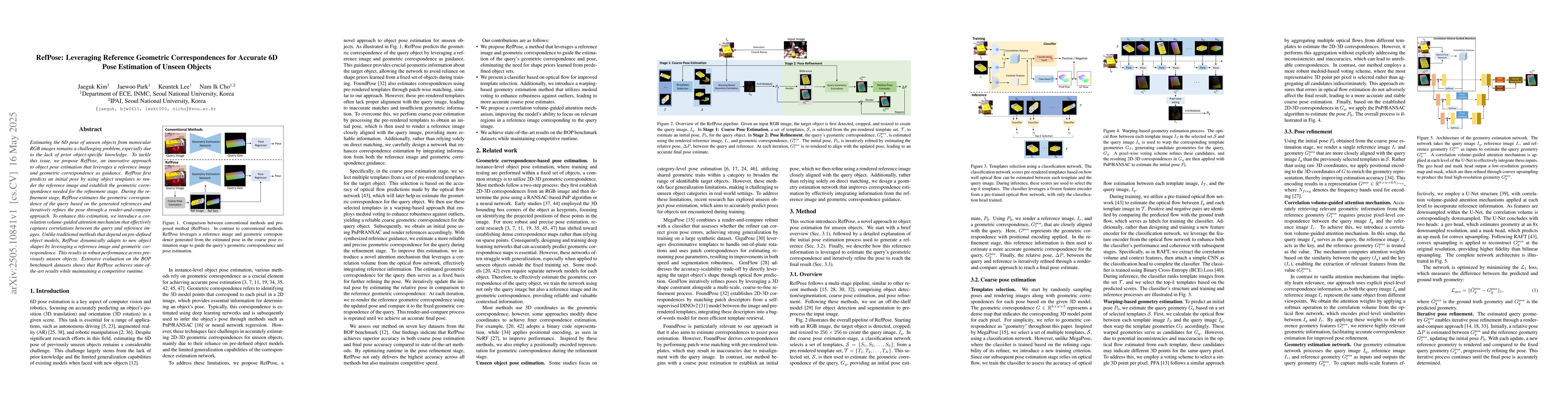 RefPose proposes a novel approach to 6D pose estimation of unseen objects using a reference image and geometric correspondence, achieving state-of-the-art results with robust performance.