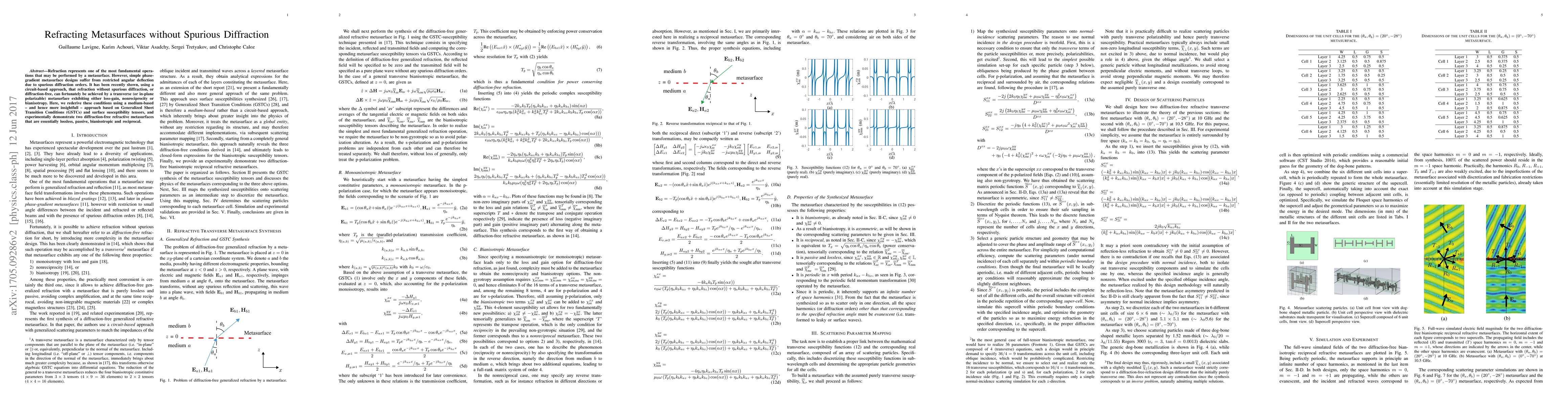 Refraction represents one of the most fundamental operations that may be performed by a metasurface. However, simple phasegradient metasurface designs suffer from restricted angular deflection due to spurious diffraction orders. It has been recently shown, using a circuit-based approach, that refraction without spurious diffraction, or diffraction-free, can fortunately be achieved by a transverse metasurface exhibiting either loss-gain or bianisotropy. Here, we rederive these conditions using a medium-based - and hence more insightfull - approach based on Generalized Sheet Transition Conditions (GSTCs) and surface susceptibility tensors, and experimentally demonstrate two diffraction-free refractive metasurfaces that are essentially lossless, passive, bianisotropic and reciprocal.
