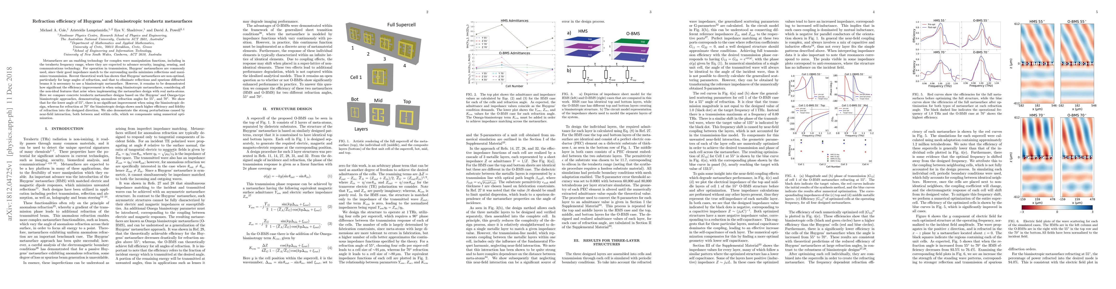 This research compares the refraction efficiency of Huygens' metasurfaces with bianisotropic metasurfaces in the terahertz frequency range, showing no significant improvement for small angles but a notable efficiency gain for large angles (70 degrees). The study also addresses perturbations from near-field interactions and optimizes metasurface designs for better performance.