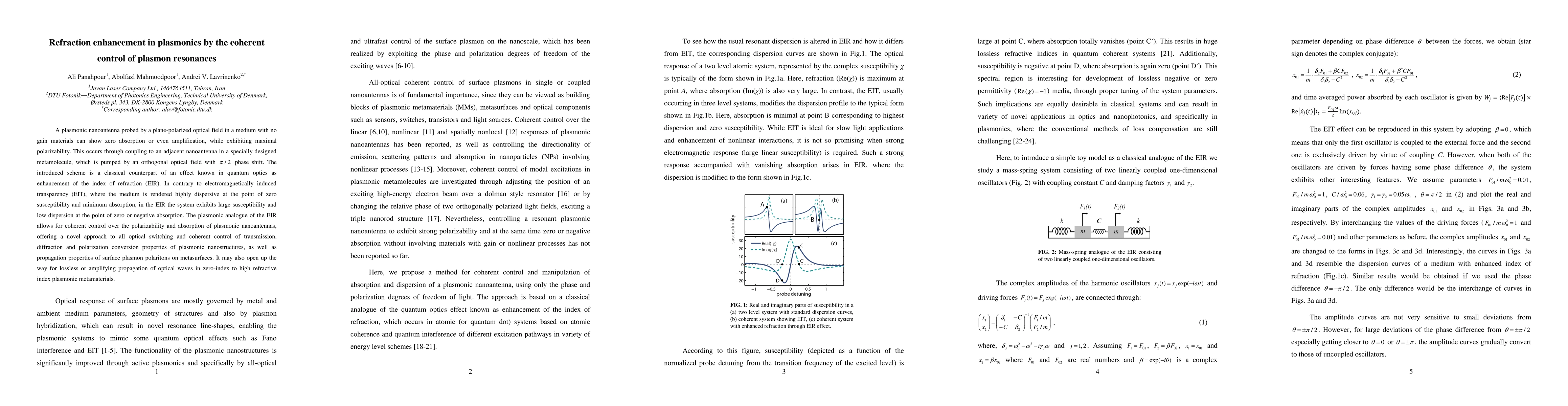 This paper proposes a method for enhancing refraction in plasmonics through coherent control of plasmon resonances, achieving zero absorption or amplification in plasmonic nanoantennas via coupling to adjacent nanoantennas in a metamolecule, and enabling novel optical switching and control over transmission and diffraction properties.