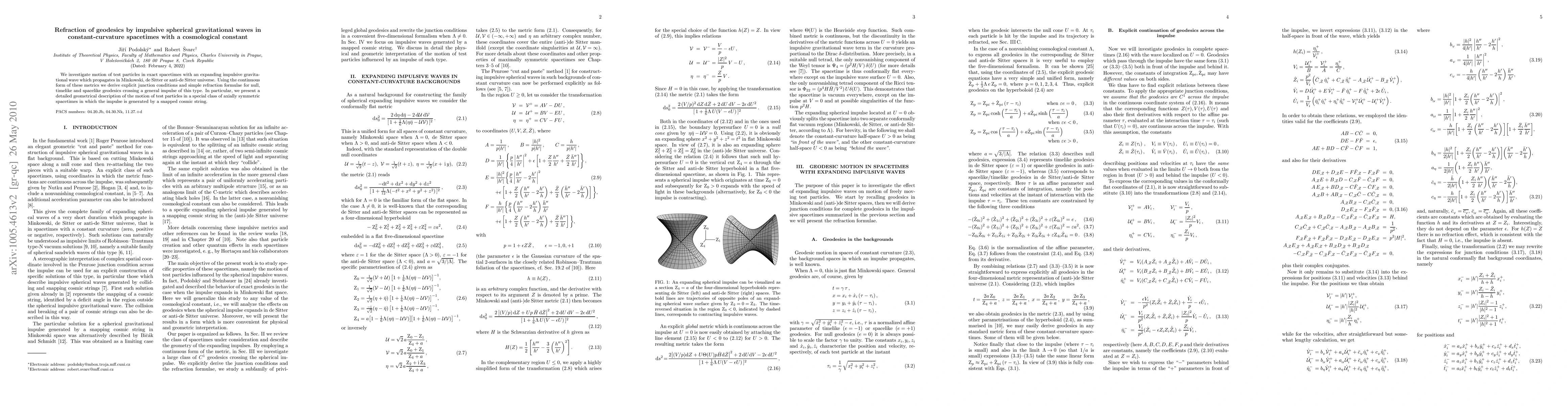 The paper explores how impulsive gravitational waves affect the paths of test particles in expanding spacetimes, deriving junction conditions and refraction formulas for geodesics in constant-curvature universes with a cosmological constant, particularly focusing on axially symmetric spacetimes generated by snapped cosmic strings.