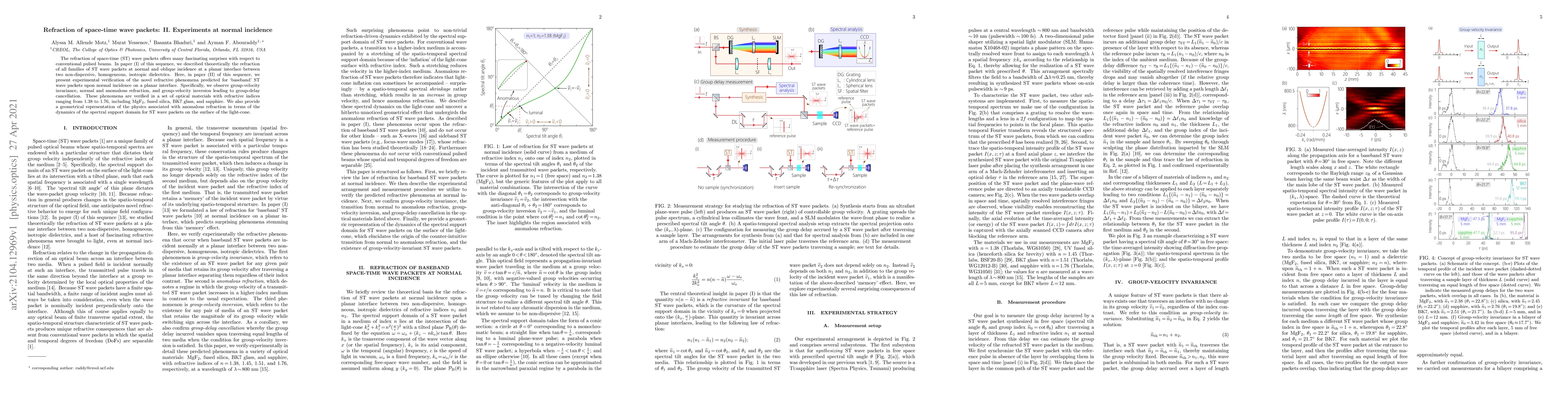 The refraction of space-time (ST) wave packets offers many fascinating surprises with respect to conventional pulsed beams. In paper (I) of this sequence, we described theoretically the refraction of all families of ST wave packets at normal and oblique incidence at a planar interface between two non-dispersive, homogeneous, isotropic dielectrics. Here, in paper (II) of this sequence, we present experimental verification of the novel refractive phenomena predicted for `baseband' ST wave packets upon normal incidence on a planar interface. Specifically, we observe group-velocity invariance, normal and anomalous refraction, and group-velocity inversion leading to group-delay cancellation. These phenomena are verified in a set of optical materials with refractive indices ranging from 1.38 to 1.76, including MgF$_2$, fused silica, BK7 glass, and sapphire. We also provide a geometrical representation of the physics associated with anomalous refraction in terms of the dynamics of the spectral support domain for ST wave packets on the surface of the light-cone.