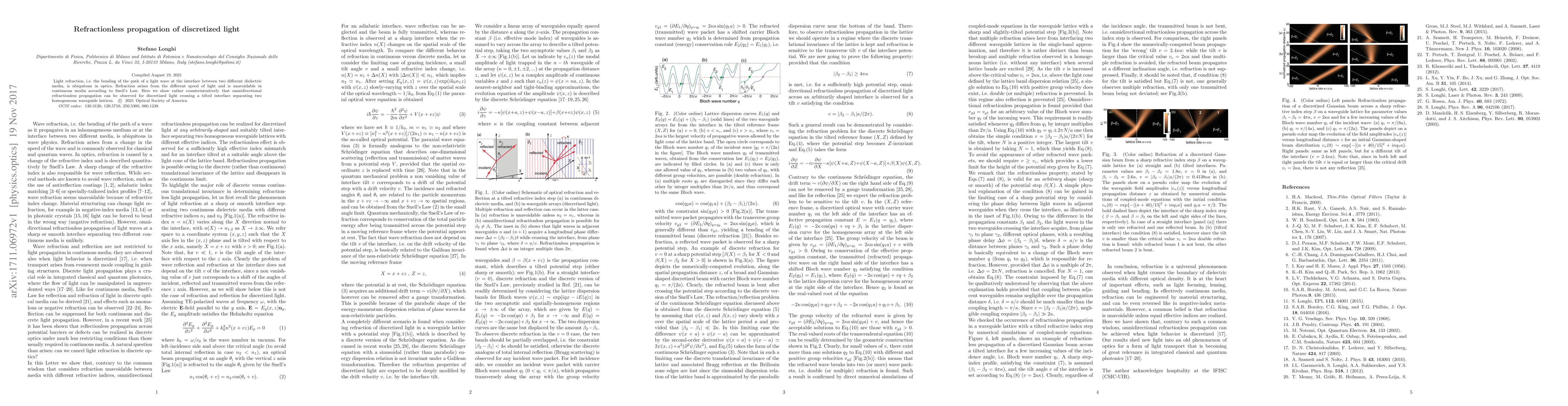 Light refraction, i.e. the bending of the path of a light wave at the interface between two different dielectric media, is ubiquitous in optics. Refraction arises from the different speed of light and is unavoidable in continuous media according to Snell's Law. Here we show rather counterintuitively that omnidirectional refractionless propagation can be observed for discretized light crossing a tilted interface separating two homogeneous waveguide lattices.
