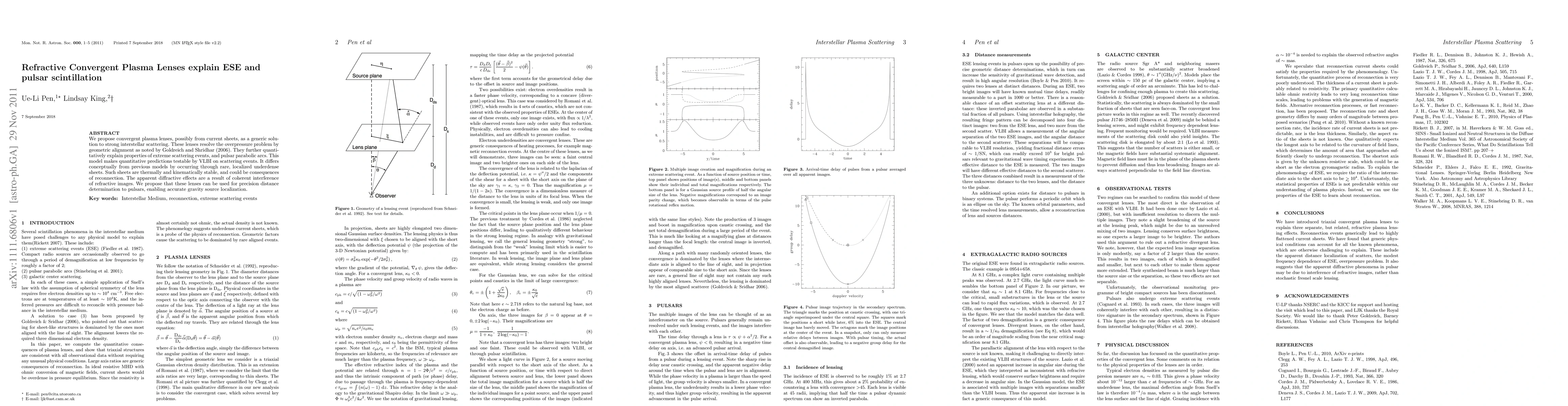 This paper proposes that convergent plasma lenses from underdense current sheets explain extreme scattering events and pulsar scintillation, resolving the overpressure issue through geometric alignment. It suggests these lenses can be used for precise pulsar distance measurements and accurate gravity source localization.