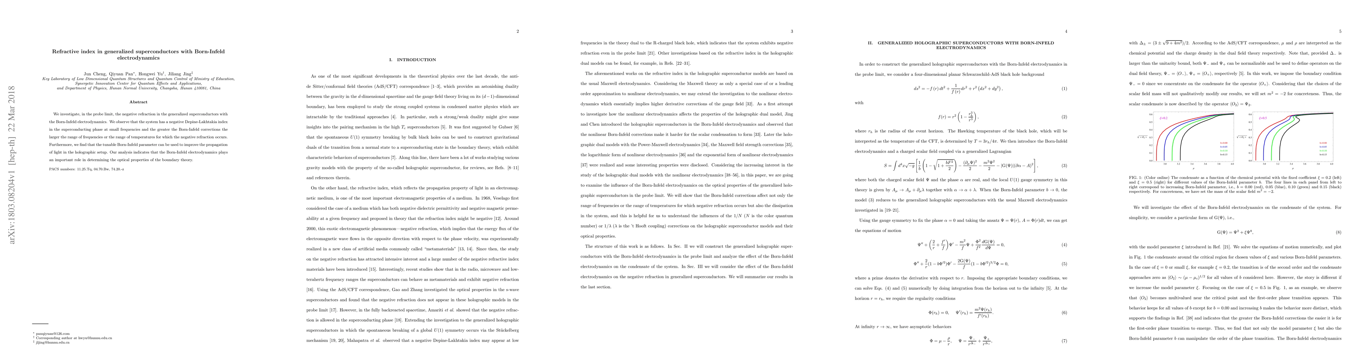 This paper explores negative refraction in generalized superconductors utilizing Born-Infeld electrodynamics, finding a negative Depine-Lakhtakia index in the superconducting phase at low frequencies, with greater Born-Infeld corrections extending the frequency range for negative refraction. The study highlights the tunable Born-Infeld parameter's potential to enhance light propagation in holographic setups.