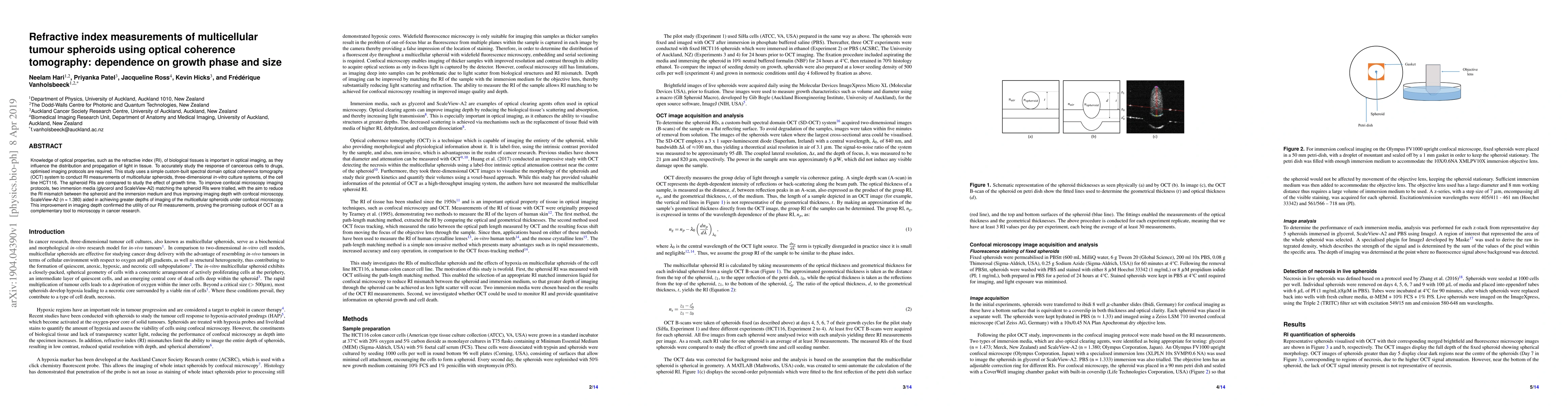 This study measures the refractive index of HCT116 multicellular tumour spheroids using optical coherence tomography, revealing variations based on growth phase. The use of ScaleView-A2 immersion medium improved confocal microscopy imaging depth, demonstrating OCT's potential as a valuable tool in cancer research.