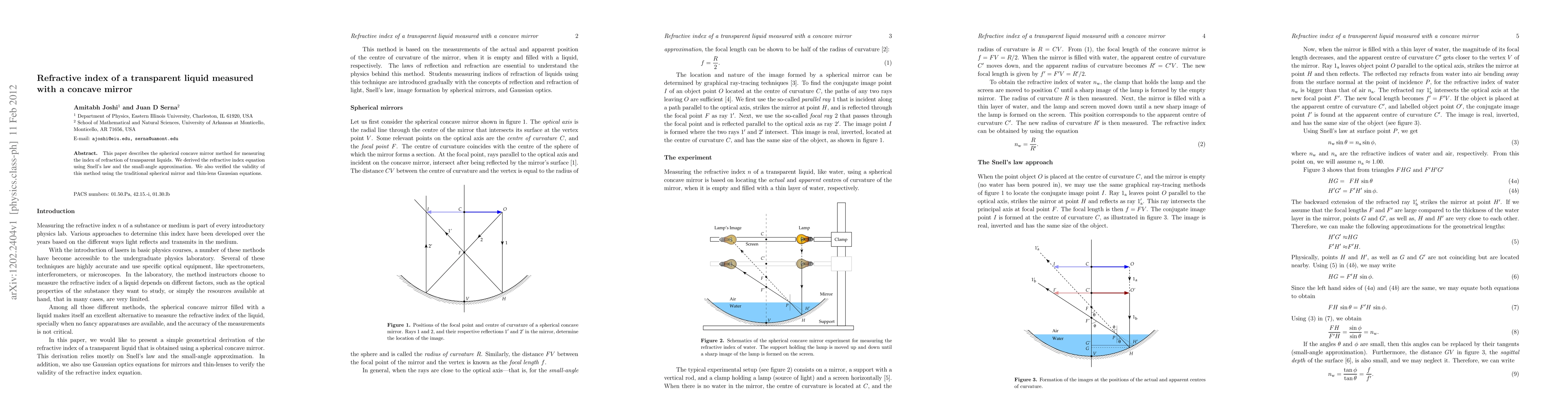 This paper describes the spherical concave mirror method for measuring the index of refraction of transparent liquids. We derived the refractive index equation using Snell's law and the small-angle approximation. We also verified the validity of this method using the traditional spherical mirror and thin-lens Gaussian equations.