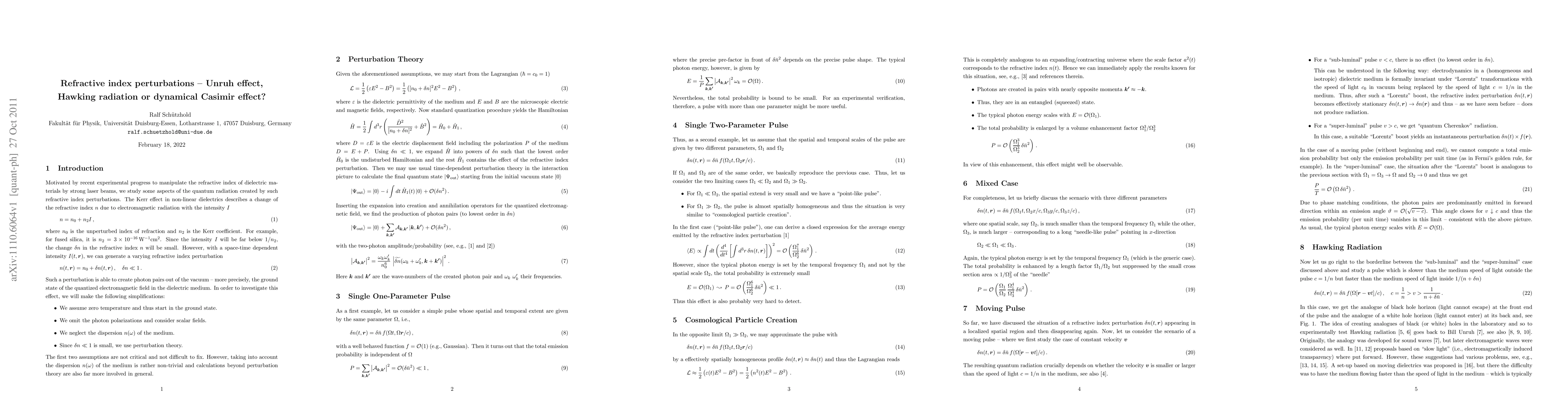 Summary: This paper investigates the quantum radiation phenomena, such as the Unruh effect, Hawking radiation, and dynamical Casimir effect, that arise from manipulating the refractive index of dielectric materials using strong laser beams. It explores the implications of these perturbations on quantum radiation.