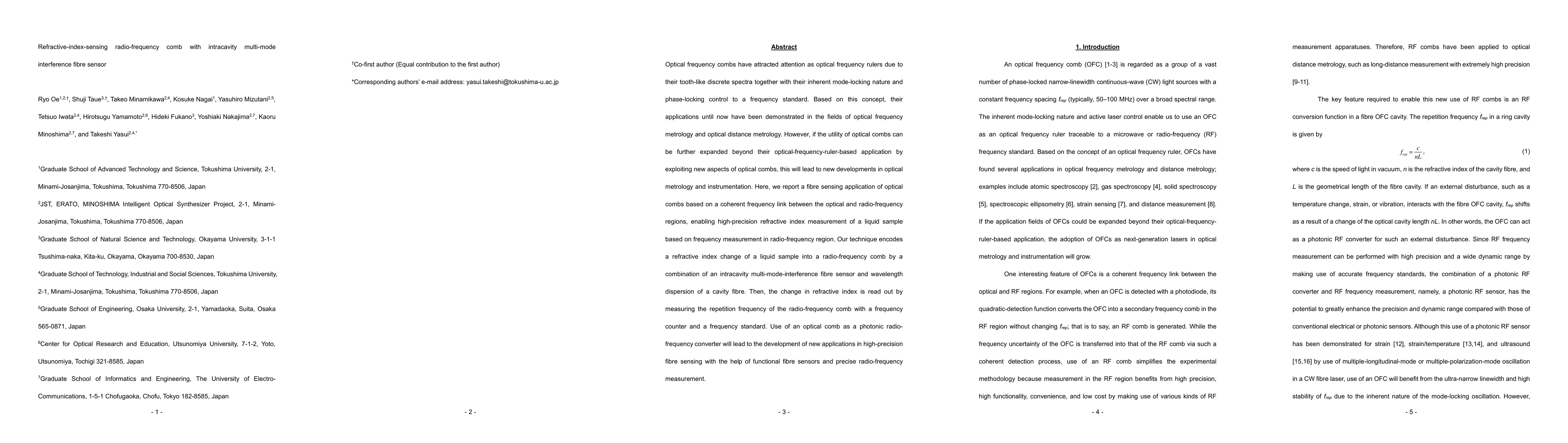 This paper presents a novel fibre sensing application of optical frequency combs, utilizing a coherent link between optical and radio-frequency regions to measure liquid sample refractive indices with high precision. The technique employs an intracavity multi-mode interference fibre sensor and wavelength dispersion, converting refractive index changes into radio-frequency comb measurements.