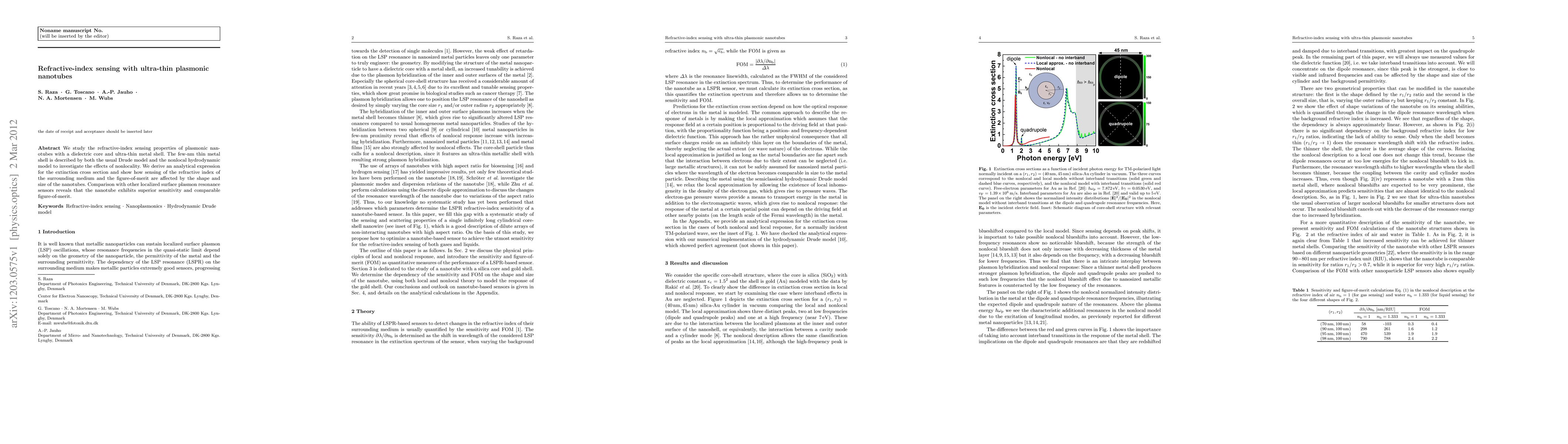 This paper investigates the refractive-index sensing capabilities of ultra-thin plasmonic nanotubes with a dielectric core and a few-nm thin metal shell, employing both Drude and nonlocal hydrodynamic models. The study reveals superior sensitivity and comparable figure-of-merit compared to other localized surface plasmon resonance sensors.