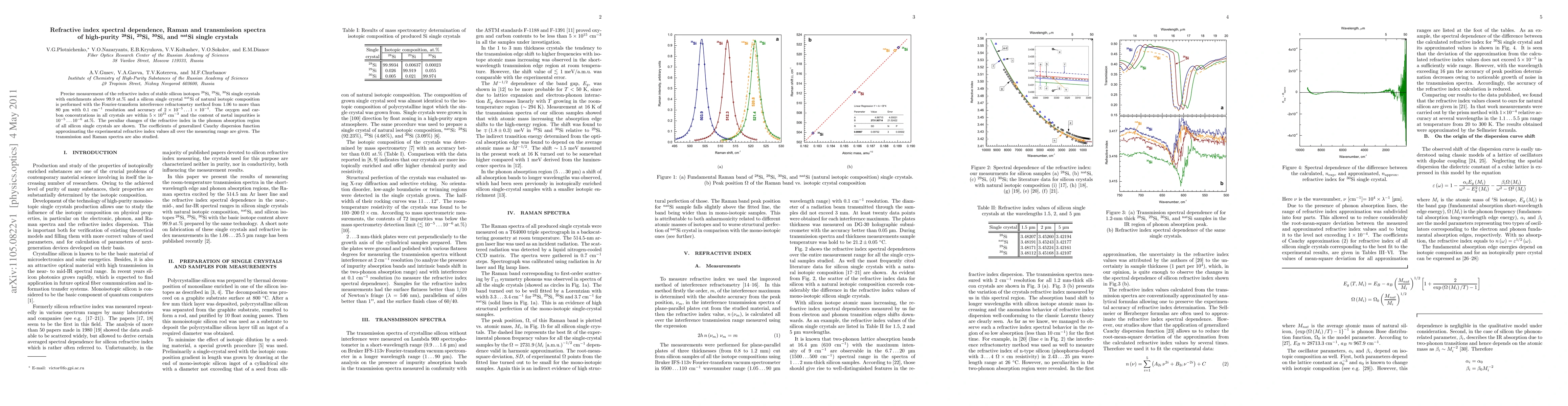 This paper presents precise measurements of the refractive index of isotopically pure silicon crystals using Fourier-transform interference refractometry, revealing unique refractive index changes in the phonon absorption region. Additionally, the study provides transmission and Raman spectra for the silicon crystals.
