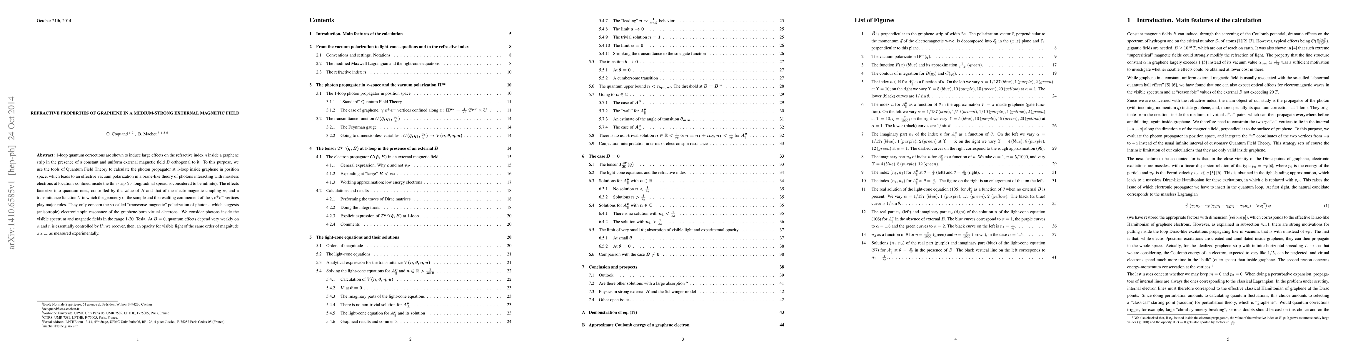 1-loop quantum corrections are shown to induce large effects on the refraction index $n$ inside a graphene strip in the presence of an external magnetic field $B$ orthogonal to it. To this purpose, we use the tools of Quantum Field Theory to calculate the photon propagator at 1-loop inside graphene in position space, which leads to an effective vacuum polarization in a brane-like theory of photons interacting with massless electrons at locations confined inside the thin strip (its longitudinal spread is considered to be infinite). The effects factorize into quantum ones, controlled by the value of $B$ and that of the electromagnetic coupling $\alpha$, and a "transmittance function" $U$ in which the geometry of the sample and the resulting confinement of electrons play the major roles. We consider photons inside the visible spectrum and magnetic fields in the range 1-20\; Teslas. At $B=0$, quantum effects depend very weakly on $\alpha$ and $n$ is essentially controlled by $U$; we recover, then, an opacity for visible light of the same order of magnitude $\pi \alpha_{vac}$ as measured experimentally.