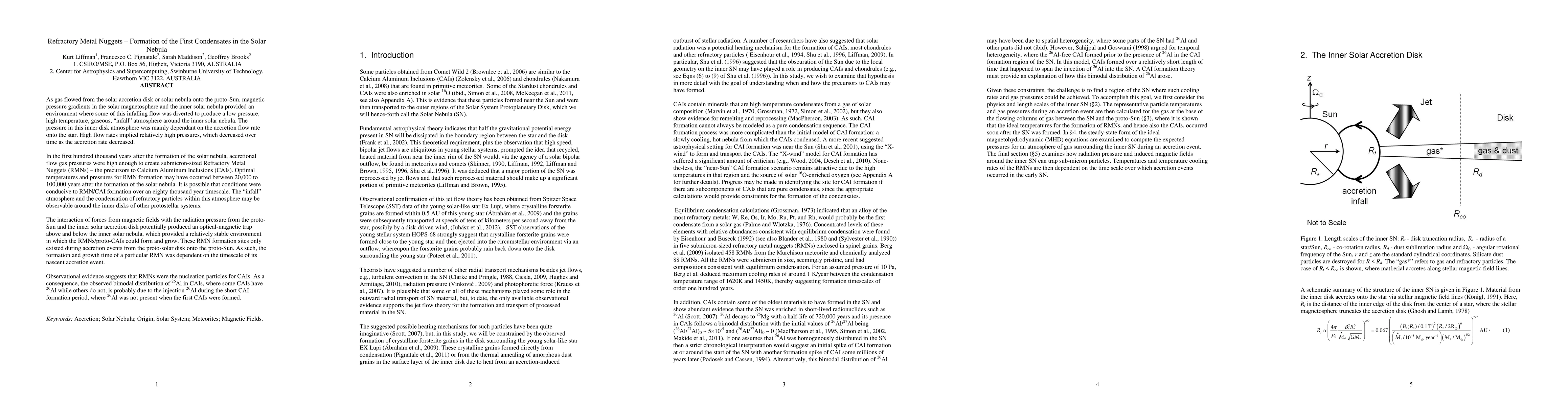As gas flowed from the solar accretion disk or solar nebula onto the proto-Sun, magnetic pressure gradients in the solar magnetosphere and the inner solar nebula provided an environment where some of this infalling flow was diverted to produce a low pressure, high temperature, gaseous, "infall" atmosphere around the inner solar nebula. The pressure in this inner disk atmosphere was mainly dependant on the accretion flow rate onto the star. High flow rates implied relatively high pressures, which decreased over time as the accretion rate decreased. In the first hundred thousand years after the formation of the solar nebula, accretional flow gas pressures were high enough to create submicron-sized Refractory Metal Nuggets (RMNs) - the precursors to Calcium Aluminum Inclusions (CAIs). Optimal temperatures and pressures for RMN formation may have occurred between 20,000 to 100,000 years after the formation of the solar nebula. It is possible that conditions were conducive to RMN/CAI formation over an eighty thousand year timescale. The "infall" atmosphere and the condensation of refractory particles within this atmosphere may be observable around the inner disks of other protostellar systems. The interaction of forces from magnetic fields with the radiation pressure from the proto-Sun and the inner solar accretion disk potentially produced an optical-magnetic trap above and below the inner solar nebula, which provided a relatively stable environment in which the RMNs/proto-CAIs could form and grow. These RMN formation sites only existed during accretion events from the proto-solar disk onto the proto-Sun. As such, the formation and growth time of a particular RMN was dependent on the timescale of its nascent accretion event.