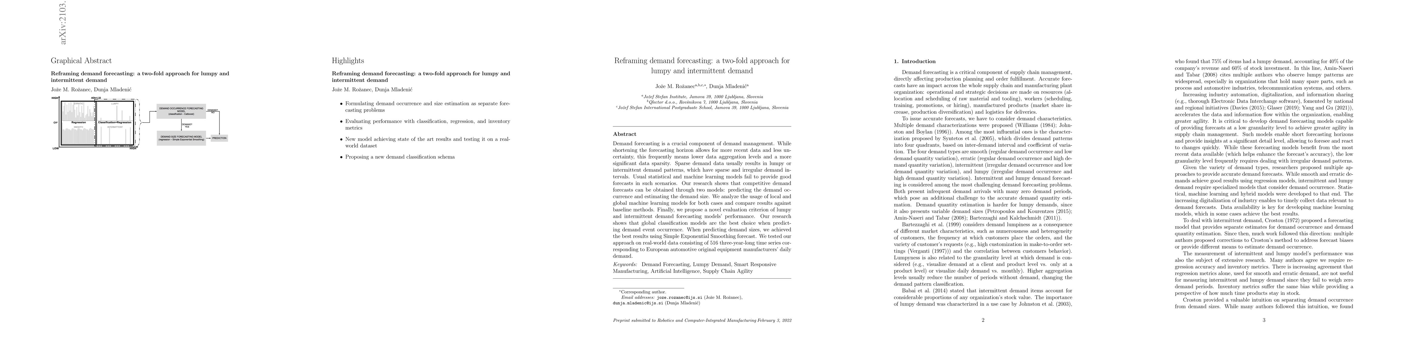 This research proposes a two-fold approach for forecasting lumpy and intermittent demand, utilizing models to predict demand occurrence and estimate demand size. The study finds global classification models most effective for occurrence prediction and Simple Exponential Smoothing for demand size estimation, tested on European automotive OEM data.