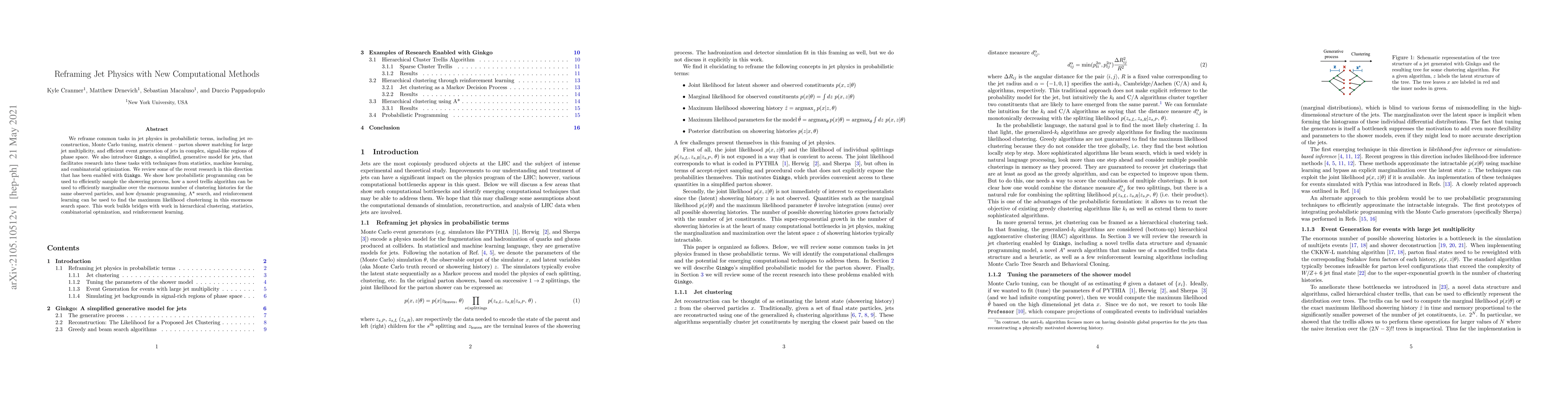 We reframe common tasks in jet physics in probabilistic terms, including jet reconstruction, Monte Carlo tuning, matrix element - parton shower matching for large jet multiplicity, and efficient event generation of jets in complex, signal-like regions of phase space. We also introduce Ginkgo, a simplified, generative model for jets, that facilitates research into these tasks with techniques from statistics, machine learning, and combinatorial optimization. We review some of the recent research in this direction that has been enabled with Ginkgo. We show how probabilistic programming can be used to efficiently sample the showering process, how a novel trellis algorithm can be used to efficiently marginalize over the enormous number of clustering histories for the same observed particles, and how dynamic programming, A* search, and reinforcement learning can be used to find the maximum likelihood clustering in this enormous search space. This work builds bridges with work in hierarchical clustering, statistics, combinatorial optmization, and reinforcement learning.