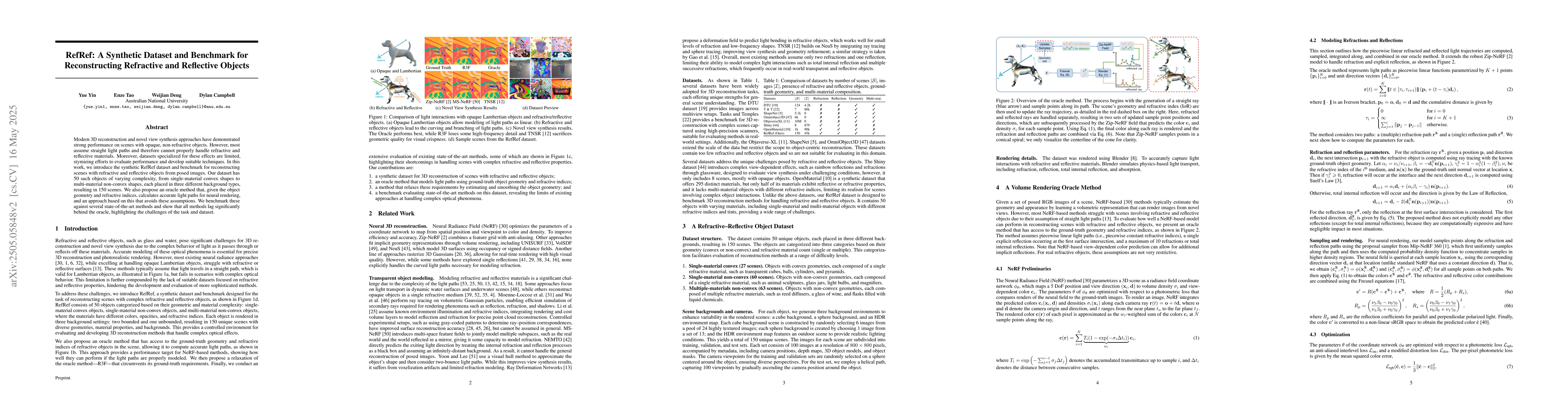 The research introduces a synthetic dataset, RefRef, containing 50 refractive and reflective objects with varying complexity in three different background types, totaling 150 scenes. An oracle method for accurate light path calculation given object geometry and refractive indices is also proposed, along with an approach based on this oracle.