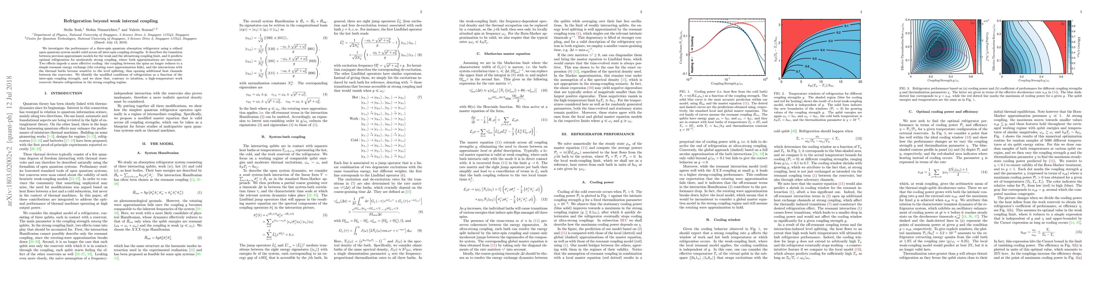 Researchers developed a new model for a three-spin quantum absorption refrigerator that predicts optimal refrigeration conditions in the moderately strong coupling regime. Contrary to intuition, a high-temperature work reservoir can hinder refrigeration at high coupling strengths.