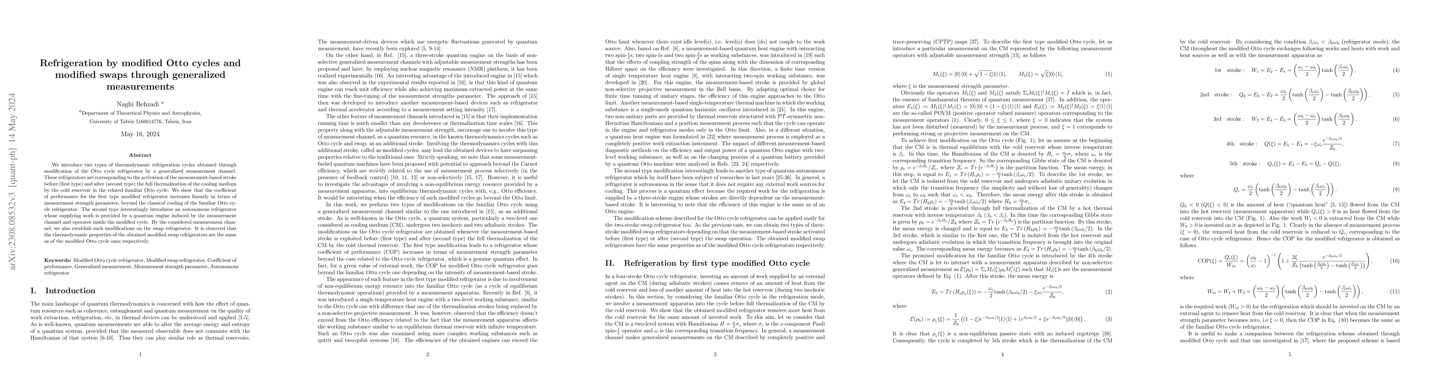 This paper introduces modified refrigeration cycles based on the Otto cycle, enhanced by generalized measurement channels. The first modified cycle shows improved performance with stronger measurements, while the second introduces a quantum engine-powered refrigerator. The study also extends these modifications to swap refrigerators, demonstrating comparable thermodynamic properties.