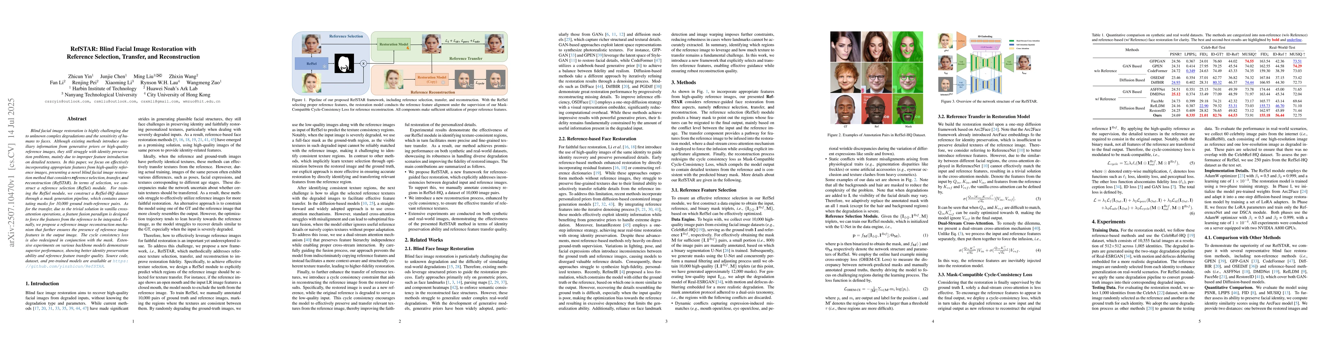 Blind facial image restoration is highly challenging due to unknown complex degradations and the sensitivity of humans to faces. Although existing methods introduce auxiliary information from generative priors or high-quality reference images, they still struggle with identity preservation problems, mainly due to improper feature introduction on detailed textures. In this paper, we focus on effectively incorporating appropriate features from high-quality reference images, presenting a novel blind facial image restoration method that considers reference selection, transfer, and reconstruction (RefSTAR). In terms of selection, we construct a reference selection (RefSel) module. For training the RefSel module, we construct a RefSel-HQ dataset through a mask generation pipeline, which contains annotating masks for 10,000 ground truth-reference pairs. As for the transfer, due to the trivial solution in vanilla cross-attention operations, a feature fusion paradigm is designed to force the features from the reference to be integrated. Finally, we propose a reference image reconstruction mechanism that further ensures the presence of reference image features in the output image. The cycle consistency loss is also redesigned in conjunction with the mask. Extensive experiments on various backbone models demonstrate superior performance, showing better identity preservation ability and reference feature transfer quality. Source code, dataset, and pre-trained models are available at https://github.com/yinzhicun/RefSTAR.