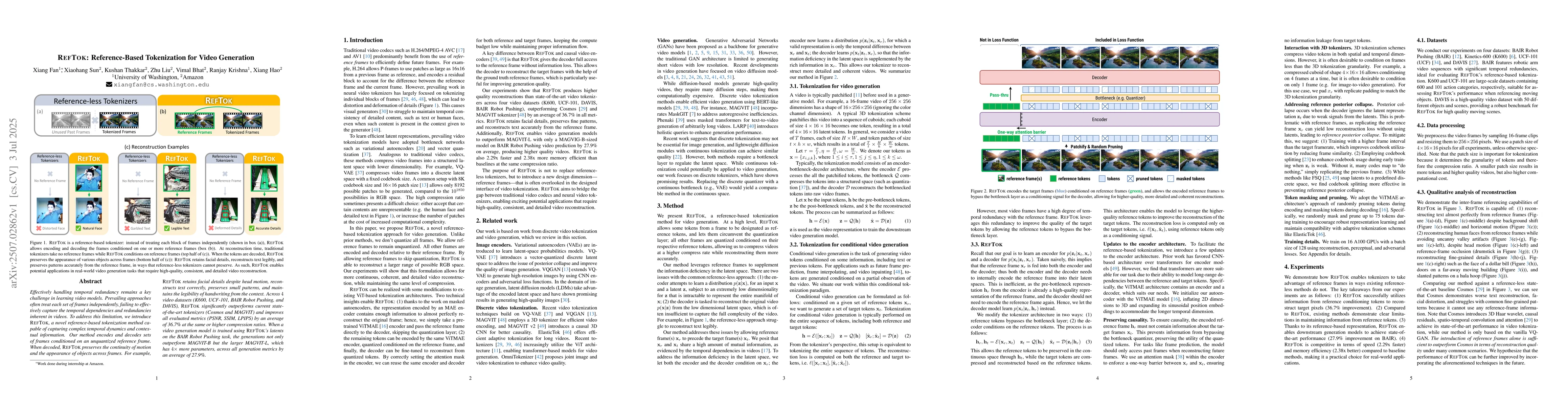 Effectively handling temporal redundancy remains a key challenge in learning video models. Prevailing approaches often treat each set of frames independently, failing to effectively capture the temporal dependencies and redundancies inherent in videos. To address this limitation, we introduce RefTok, a novel reference-based tokenization method capable of capturing complex temporal dynamics and contextual information. Our method encodes and decodes sets of frames conditioned on an unquantized reference frame. When decoded, RefTok preserves the continuity of motion and the appearance of objects across frames. For example, RefTok retains facial details despite head motion, reconstructs text correctly, preserves small patterns, and maintains the legibility of handwriting from the context. Across 4 video datasets (K600, UCF-101, BAIR Robot Pushing, and DAVIS), RefTok significantly outperforms current state-of-the-art tokenizers (Cosmos and MAGVIT) and improves all evaluated metrics (PSNR, SSIM, LPIPS) by an average of 36.7% at the same or higher compression ratios. When a video generation model is trained using RefTok's latents on the BAIR Robot Pushing task, the generations not only outperform MAGVIT-B but the larger MAGVIT-L, which has 4x more parameters, across all generation metrics by an average of 27.9%.