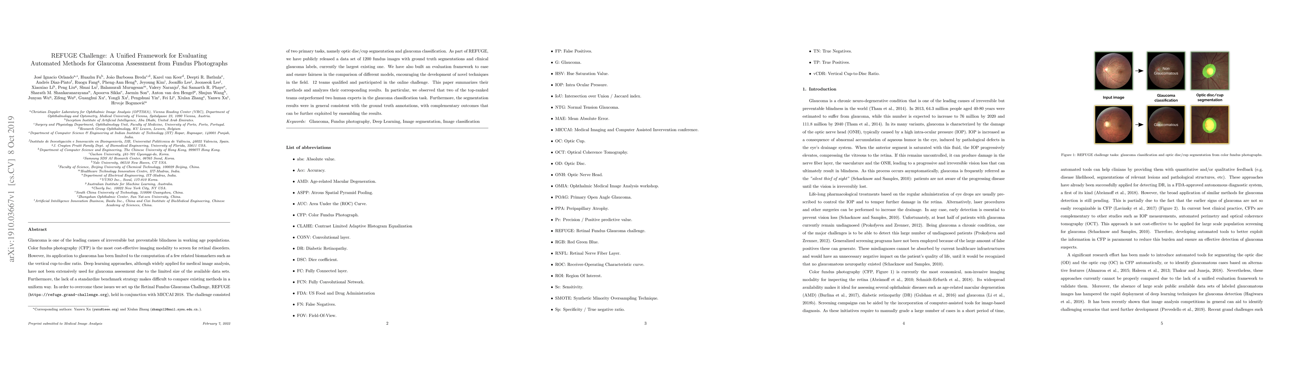 The REFUGE Challenge introduced a unified framework for evaluating automated glaucoma assessment methods using fundus photographs, releasing a large dataset and encouraging the development of novel techniques. The challenge demonstrated that top-performing deep learning models could outperform human experts in glaucoma classification, highlighting the potential of advanced imaging analysis.