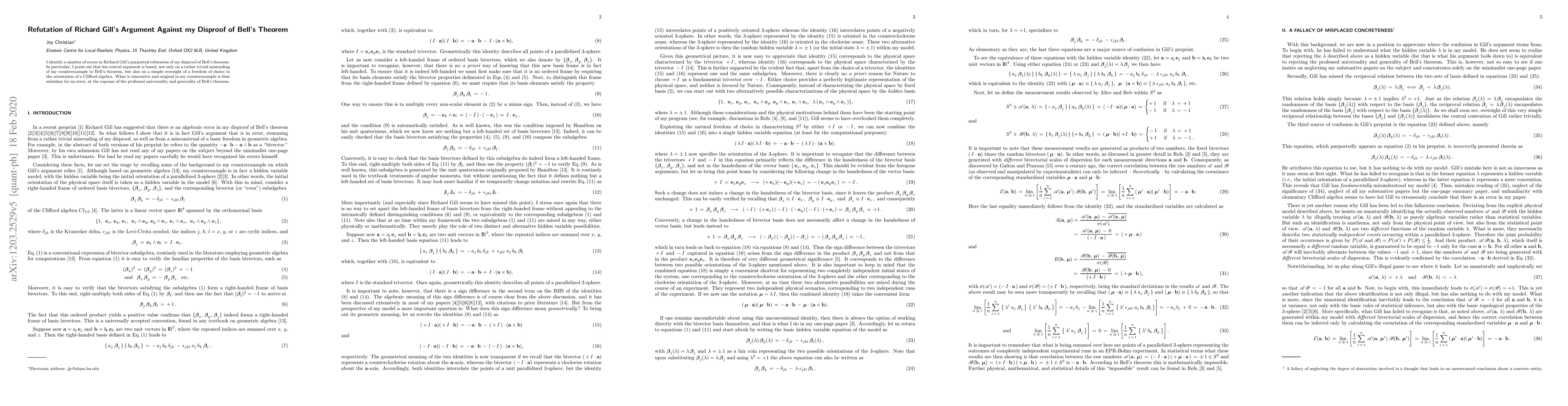 I identify a number of errors in Richard Gill's purported refutation (arXiv:1203.1504) of my disproof of Bell's theorem. In particular, I point out that his central argument is based, not only on a rather trivial misreading of my counterexample to Bell's theorem, but also on a simple oversight of a freedom of choice in the orientation of a Clifford algebra. What is innovative and original in my counterexample is thus mistaken for an error, at the expense of the professed universality and generality of Bell's theorem.