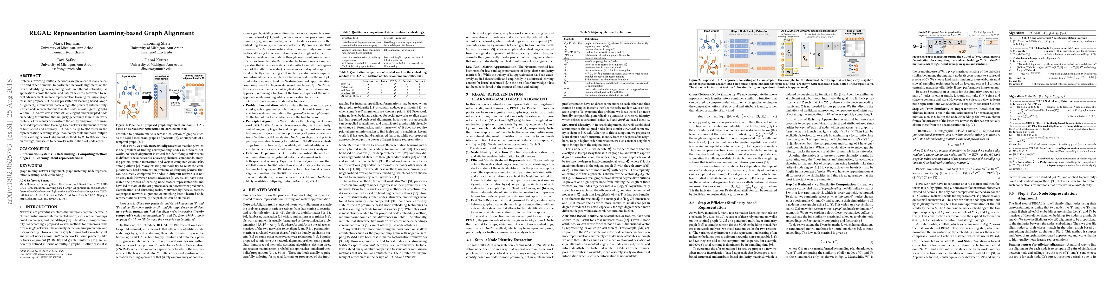 REGAL is a framework for network alignment using representation learning, which leverages automatically-learned node embeddings to identify corresponding nodes across multiple graphs. It introduces xNetMF, a scalable and accurate method for multi-network problems, achieving up to 30x faster representation learning and 20-30% higher accuracy compared to existing methods.