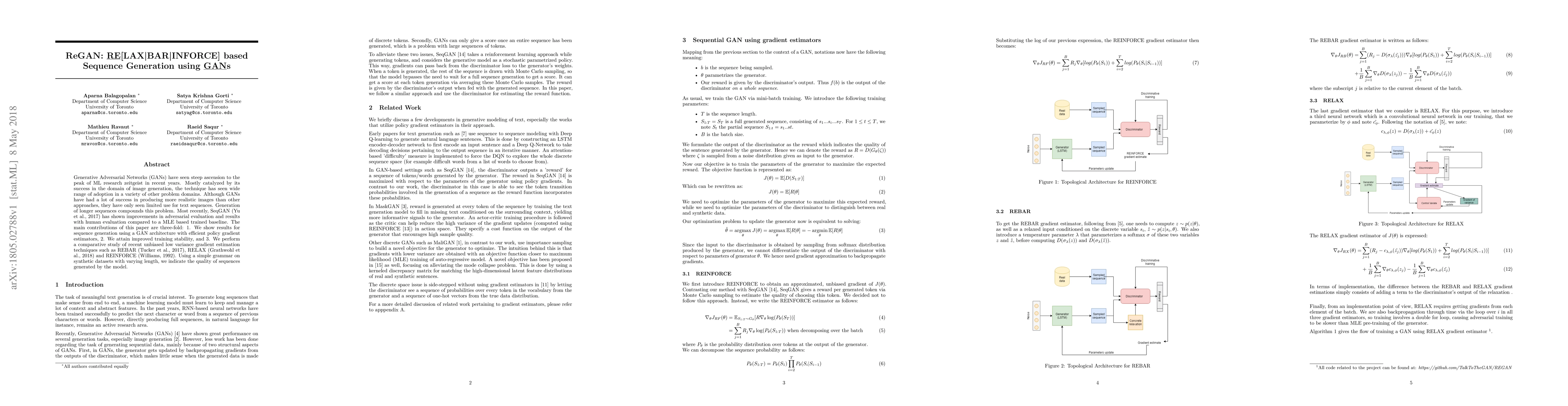 Generative Adversarial Networks (GANs) have seen steep ascension to the peak of ML research zeitgeist in recent years. Mostly catalyzed by its success in the domain of image generation, the technique has seen wide range of adoption in a variety of other problem domains. Although GANs have had a lot of success in producing more realistic images than other approaches, they have only seen limited use for text sequences. Generation of longer sequences compounds this problem. Most recently, SeqGAN (Yu et al., 2017) has shown improvements in adversarial evaluation and results with human evaluation compared to a MLE based trained baseline. The main contributions of this paper are three-fold: 1. We show results for sequence generation using a GAN architecture with efficient policy gradient estimators, 2. We attain improved training stability, and 3. We perform a comparative study of recent unbiased low variance gradient estimation techniques such as REBAR (Tucker et al., 2017), RELAX (Grathwohl et al., 2018) and REINFORCE (Williams, 1992). Using a simple grammar on synthetic datasets with varying length, we indicate the quality of sequences generated by the model.