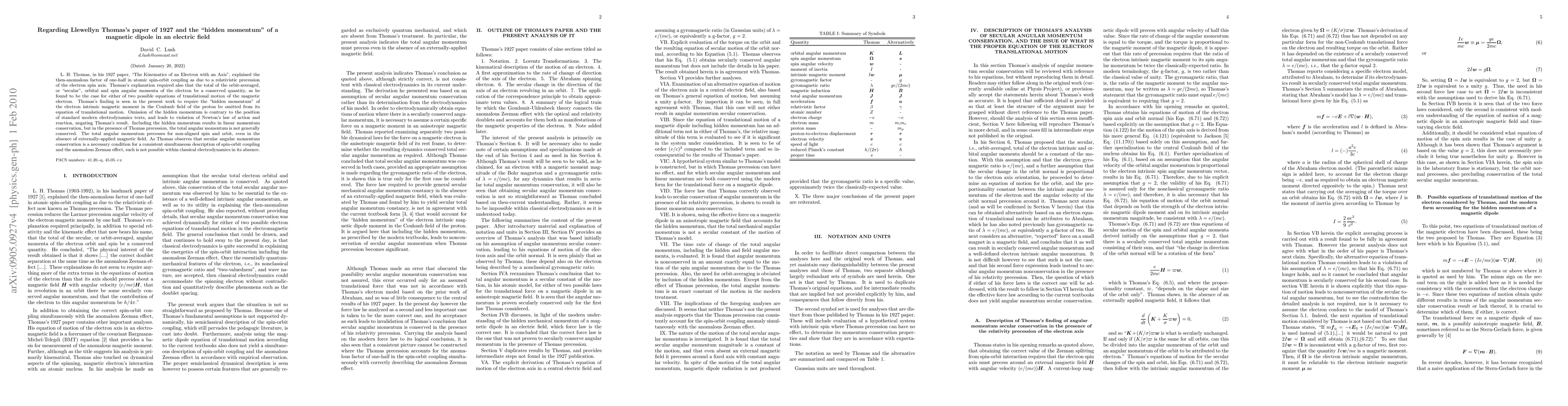 L. H. Thomas, in his 1927 paper, "The Kinematics of an Electron with an Axis", explained the then-anomalous factor of one-half in atomic spin-orbit coupling as due to a relativistic precession of the electron spin axis. Thomas's explanation required also that the total of the orbit-averaged, or "secular", orbital and spin angular momenta of the electron be a conserved quantity, as he found to be the case for either of two possible equations of translational motion of the magnetic electron. Thomas's finding is seen in the present work to require the "hidden momentum" of the electron intrinsic magnetic moment in the Coulomb field of the proton be omitted from its equation of translational motion. Omission of the hidden momentum is contrary to the position of standard modern electrodynamics texts, and leads to violation of Newton's law of action and reaction, negating Thomas's result. Including the hidden momentum results in linear momentum conservation, but in the presence of Thomas precession, the total angular momentum is not generally conserved. The total angular momentum precesses for non-aligned spin and orbit, even in the absence of externally-applied magnetic field. As Thomas observes that secular angular momentum conservation is a necessary condition for a consistent simultaneous description of spin-orbit coupling and the anomalous Zeeman effect, such is not possible within classical electrodynamics in its absence.