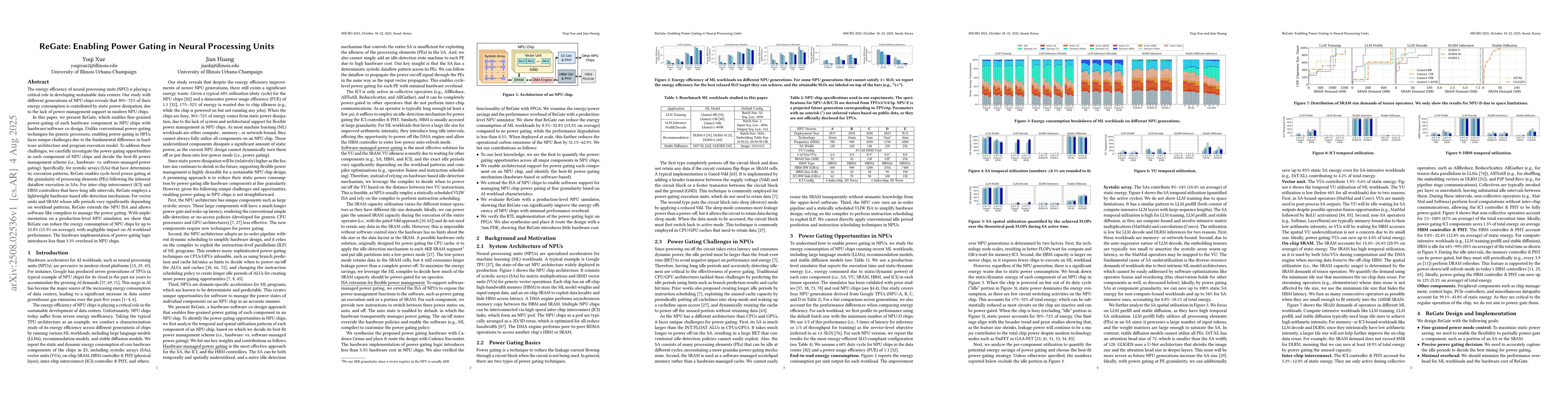 The energy efficiency of neural processing units (NPU) is playing a critical role in developing sustainable data centers. Our study with different generations of NPU chips reveals that 30%-72% of their energy consumption is contributed by static power dissipation, due to the lack of power management support in modern NPU chips. In this paper, we present ReGate, which enables fine-grained power-gating of each hardware component in NPU chips with hardware/software co-design. Unlike conventional power-gating techniques for generic processors, enabling power-gating in NPUs faces unique challenges due to the fundamental difference in hardware architecture and program execution model. To address these challenges, we carefully investigate the power-gating opportunities in each component of NPU chips and decide the best-fit power management scheme (i.e., hardware- vs. software-managed power gating). Specifically, for systolic arrays (SAs) that have deterministic execution patterns, ReGate enables cycle-level power gating at the granularity of processing elements (PEs) following the inherent dataflow execution in SAs. For inter-chip interconnect (ICI) and HBM controllers that have long idle intervals, ReGate employs a lightweight hardware-based idle-detection mechanism. For vector units and SRAM whose idle periods vary significantly depending on workload patterns, ReGate extends the NPU ISA and allows software like compilers to manage the power gating. With implementation on a production-level NPU simulator, we show that ReGate can reduce the energy consumption of NPU chips by up to 32.8% (15.5% on average), with negligible impact on AI workload performance. The hardware implementation of power-gating logic introduces less than 3.3% overhead in NPU chips.