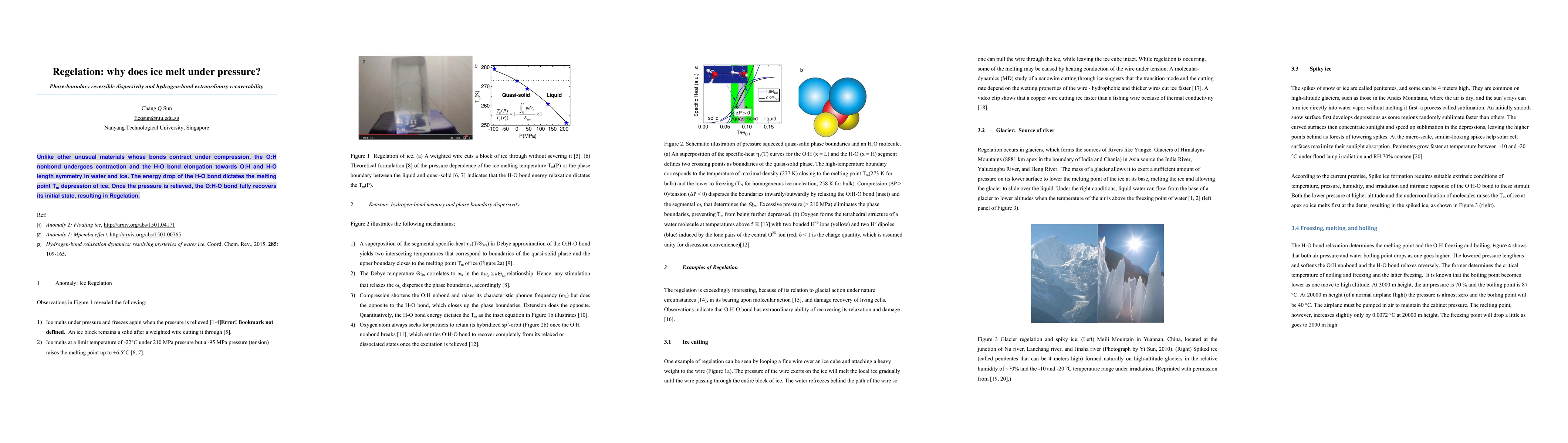Unlike other unusual materials whose bonds contract under compression, the O:H nonbond undergoes contraction and the H-O bond elongation towards O:H and H-O length symmetry in water and ice. The energy drop of the H-O bond dictates the melting point Tm depression of ice. Once the pressure is relieved, the O:H-O bond fully recovers its initial state, resulting in Regelation.