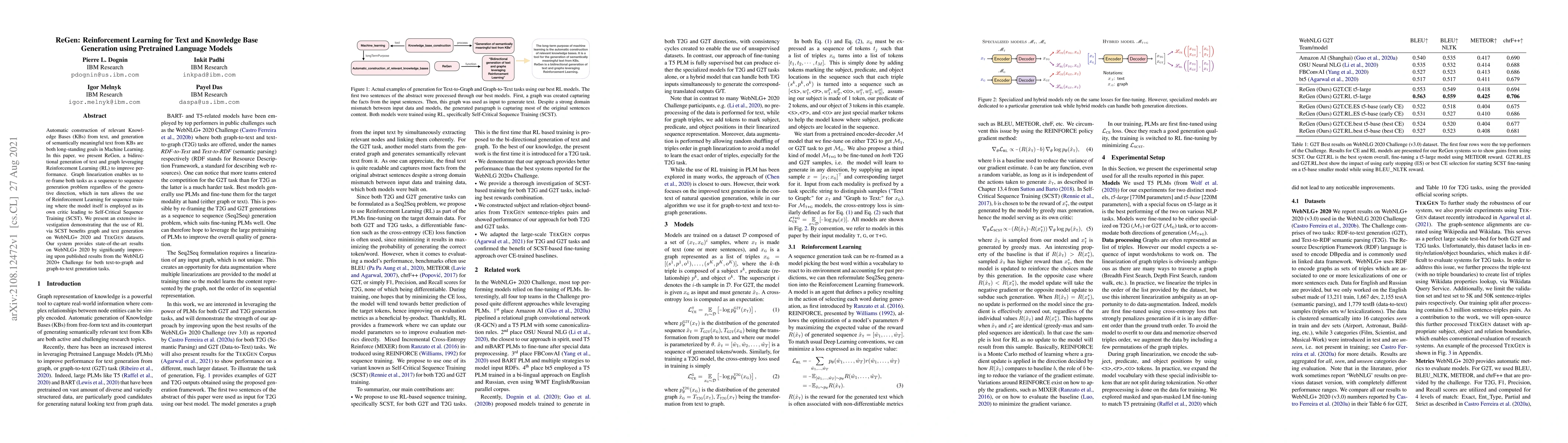 Automatic construction of relevant Knowledge Bases (KBs) from text, and generation of semantically meaningful text from KBs are both long-standing goals in Machine Learning. In this paper, we present ReGen, a bidirectional generation of text and graph leveraging Reinforcement Learning (RL) to improve performance. Graph linearization enables us to re-frame both tasks as a sequence to sequence generation problem regardless of the generative direction, which in turn allows the use of Reinforcement Learning for sequence training where the model itself is employed as its own critic leading to Self-Critical Sequence Training (SCST). We present an extensive investigation demonstrating that the use of RL via SCST benefits graph and text generation on WebNLG+ 2020 and TekGen datasets. Our system provides state-of-the-art results on WebNLG+ 2020 by significantly improving upon published results from the WebNLG 2020+ Challenge for both text-to-graph and graph-to-text generation tasks.